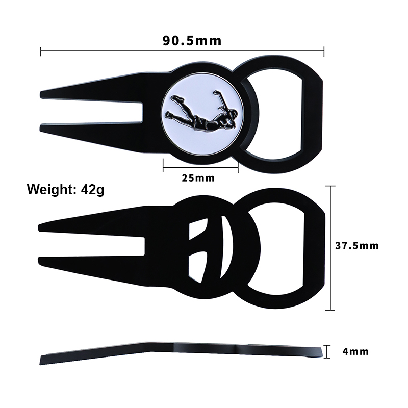 This 51g (74.6mm) black tool doubles as a divot repair fork and bottle opener. Adorned with a white 4-leaf clover, it’s sleek, durable, and practical—perfect for fixing greens mid-round, then popping open a post-game drink with a touch of luck.