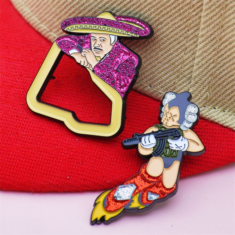 Product : Mixed Cartoon & Mexico Flag Enamel Pins Weight: 23g Color : Gold, Black nickel Bold Cap Adornments, Featuring detailed cartoon characters (with weapon/flame accents) and rhinestone-trimmed Mexico flag designs, these pins decorate caps/bags—ideal for cartoon/culture fans craving bold, unique accessory flair.