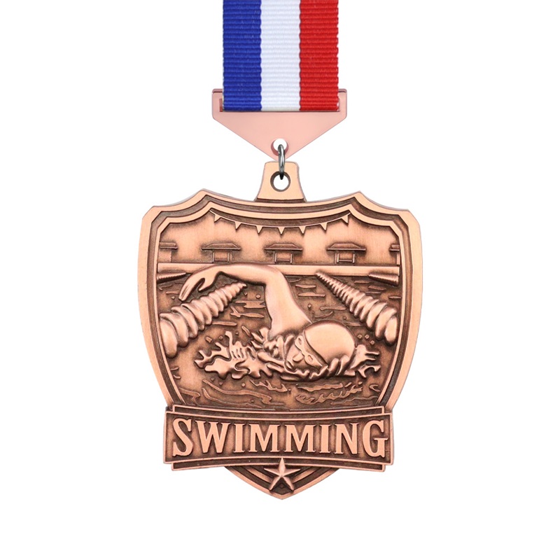 This striking shield-style swimming medal (crafted in antique gold, silver, and copper) suits a range of aquatic competitions—be it school swim galas, local tourneys, or recreational races. As a prized top-tier award, it celebrates swimmers’ hard-fought performances, infusing award ceremonies with a polished, esteemed touch.