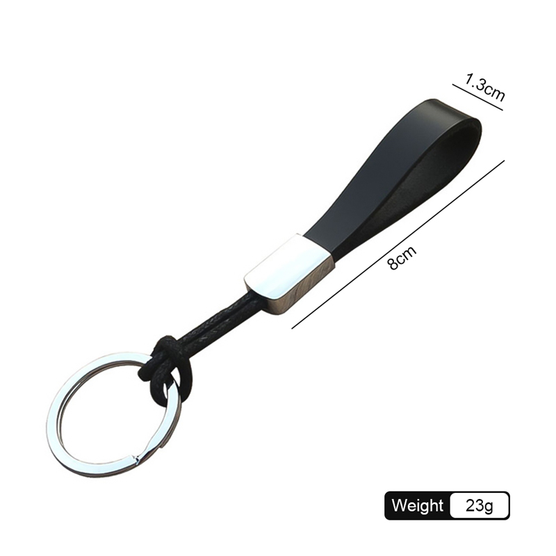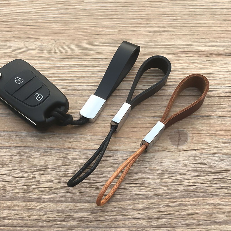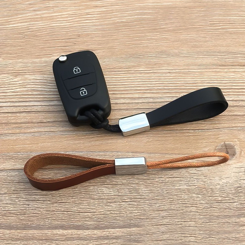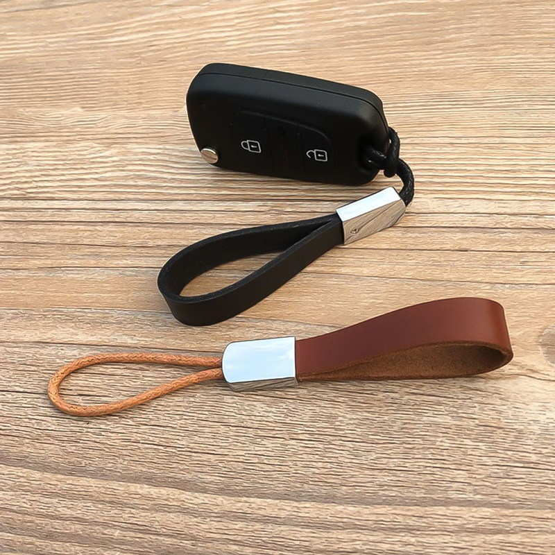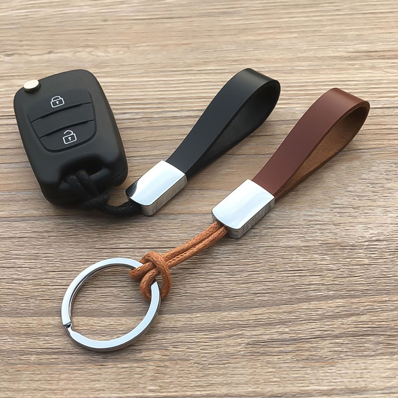 These leather keychains, one black and one brown, have metal accents. The black one connects to a car key, both with sleek designs, durable leather, serving as stylish and practical accessories for car key organization.