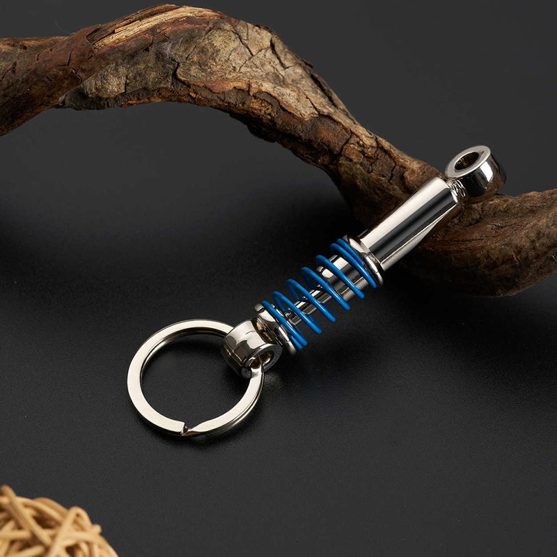 This keychain boasts a sleek metal shock absorber design, with a blue spring coiled around a silver cylindrical component, attached to a metal key ring. It embodies an industrial, automotive-inspired aesthetic, blending mechanical detailing and polished metal for a distinctive, gearhead-friendly look.