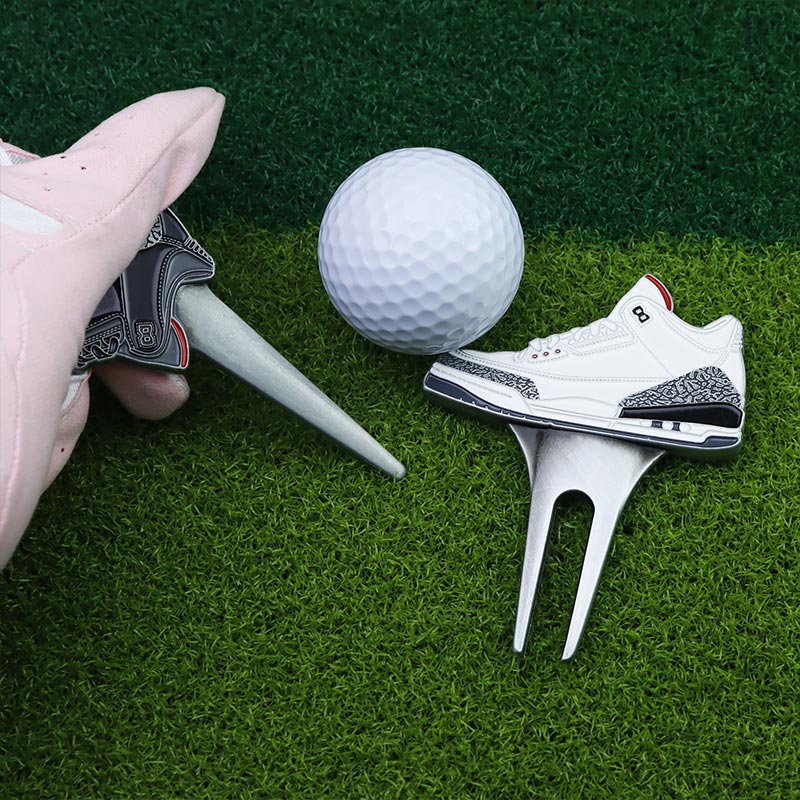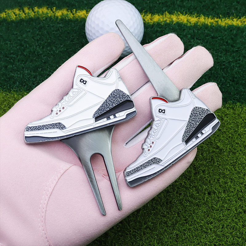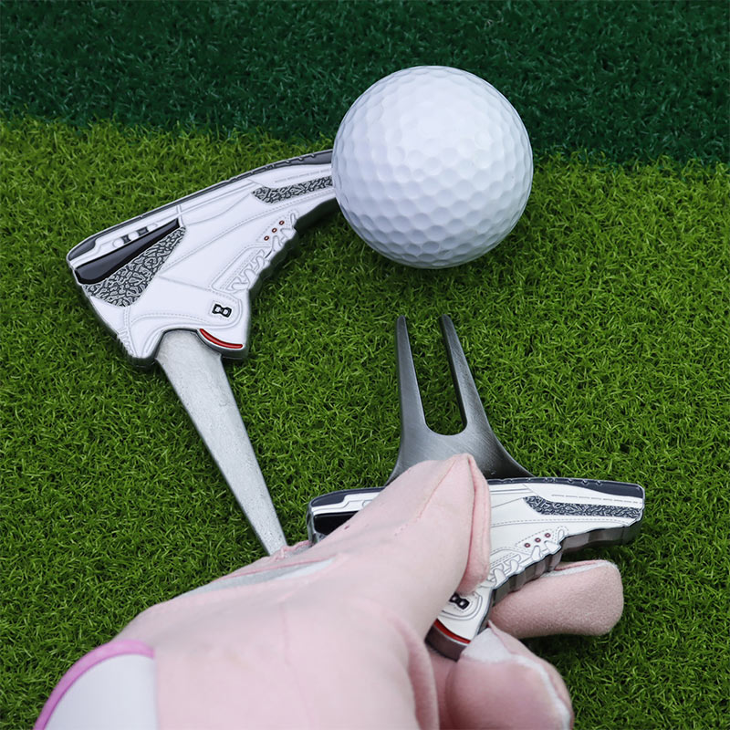 This 72g (90mm) sneaker-shaped tool (white/black/gray) fixes green divots with its 6mm sturdy build. Its detailed cement-print design mirrors iconic footwear, merging street style with on-course utility—ideal for trend-driven golfers.
