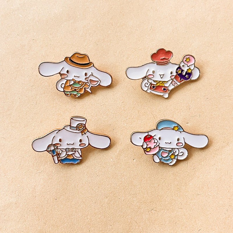 4 cute Cinnamoroll pins (with varied charming outfits) — whimsical, sweet flair. Perfect for Sanrio fans to add delicate style to bags/jackets; ideal for daily wear or cute character collectible decor.