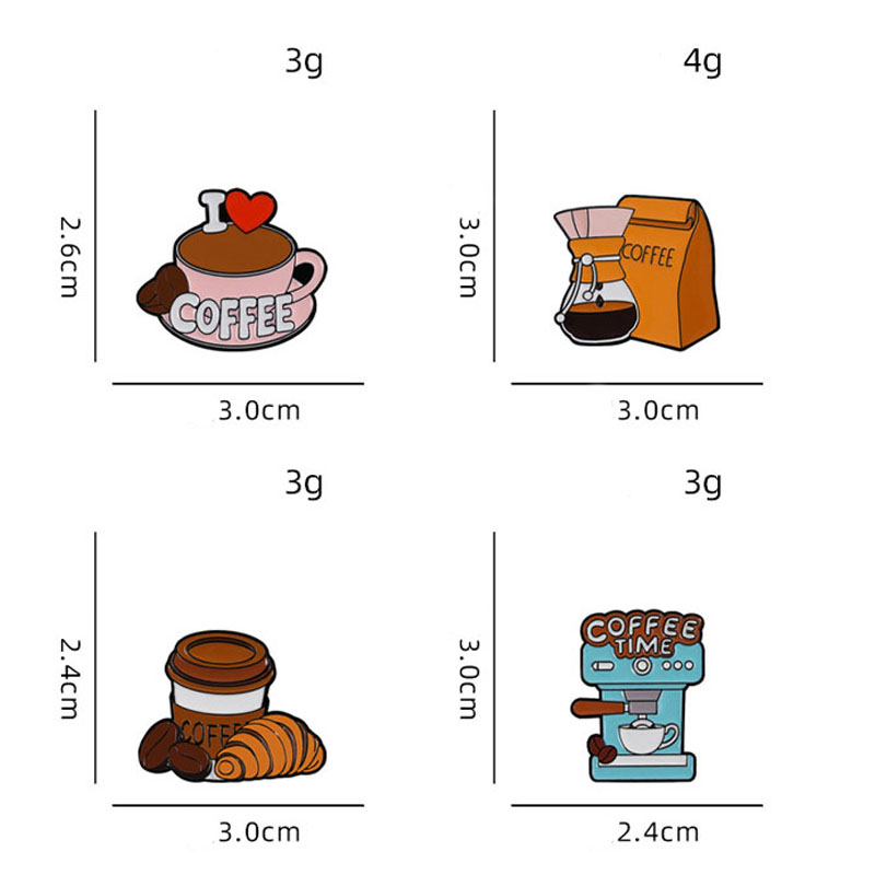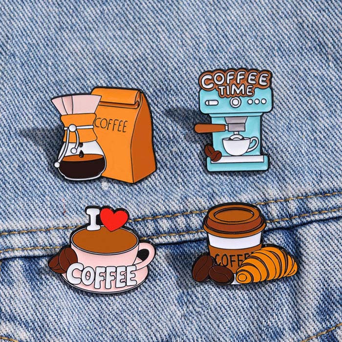 Features 4 glossy designs (I ❤️ Coffee mug, espresso machine, pour-over set, coffee + croissant)—warm, playful vibes. Perfect for caffeine fans to add cozy flair to bags/jackets, ideal for daily styling or café-themed accessory decor.