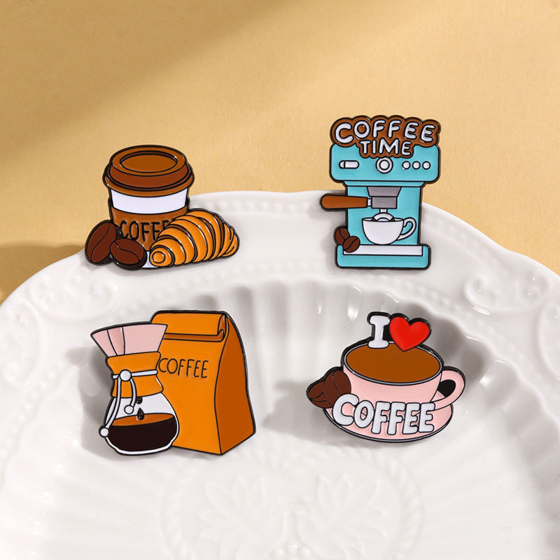 This coffee pin set has 4 glossy designs (I ❤️ Coffee mug, espresso machine, pour-over set, coffee + croissant)—warm, playful nods to caffeine culture. For coffee lovers, it adds cozy flair to bags/jackets, ideal for daily styling or charming café-themed accessory decor.