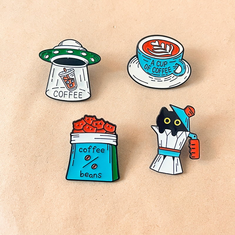 This coffee-themed pin set has 4 glossy enamel designs (UFO coffee, latte, bean bag, cat brewer)—playful nods to caffeine culture. For coffee lovers, it adds quirky, cozy flair to bags/jackets, ideal for daily styling or café-themed accessory decor.