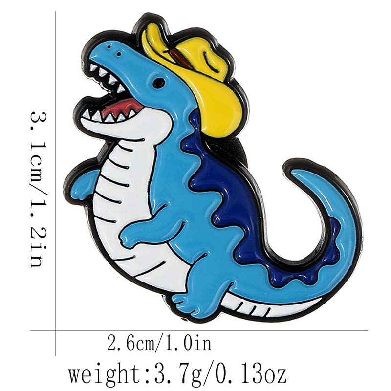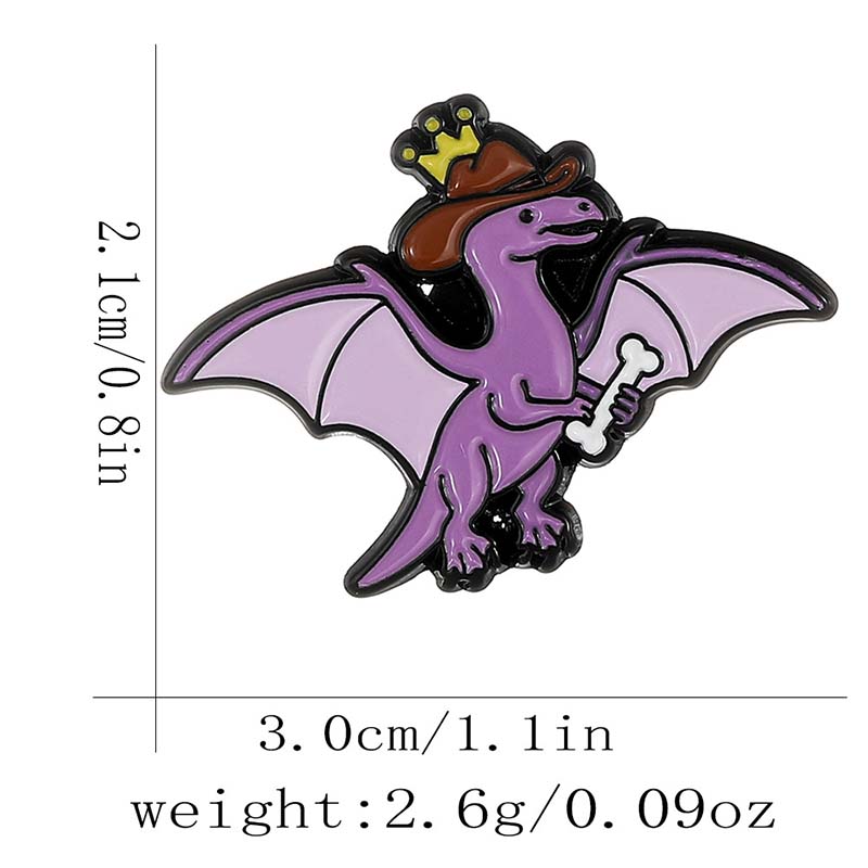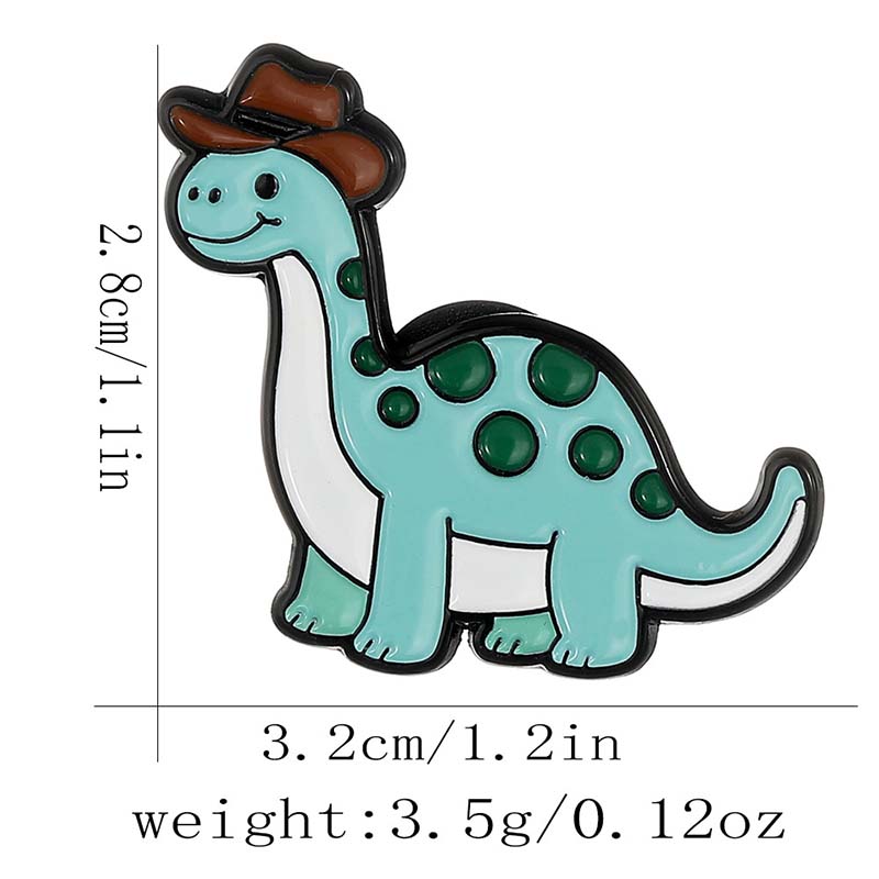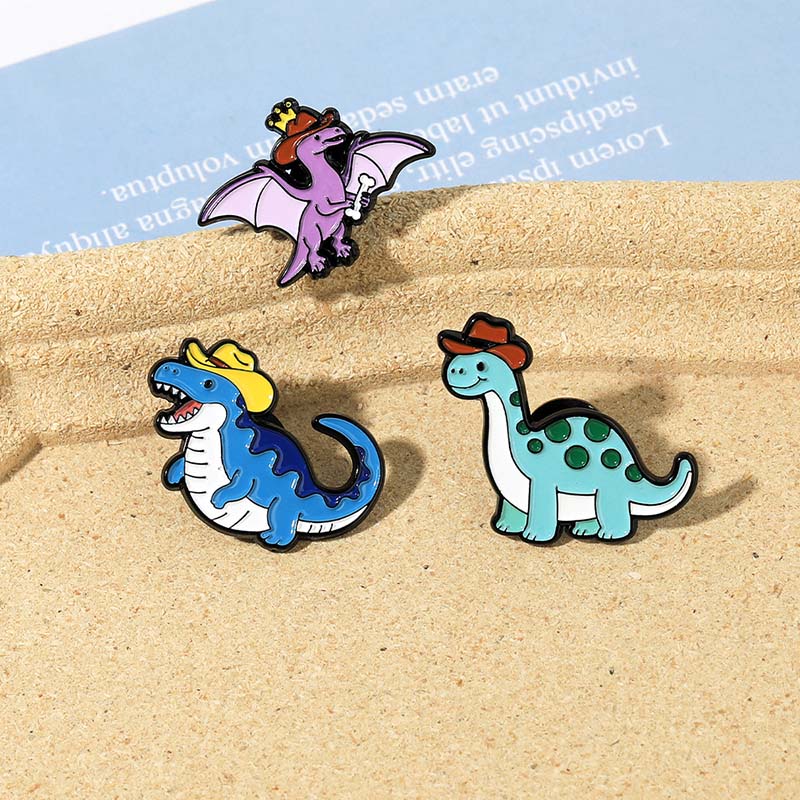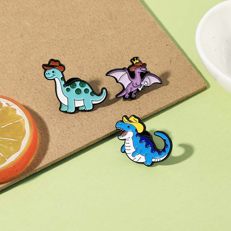 3 playful pins (cowboy-hat-wearing dinosaurs: purple dragon, blue T-rex, spotted sauropod) — vivid enamel, quirky Western-prehistoric fusion. Perfect for adding whimsical flair to bags/jackets; ideal for dino/western fans’ collectibles.