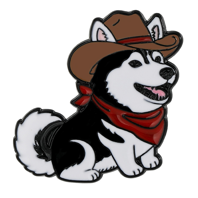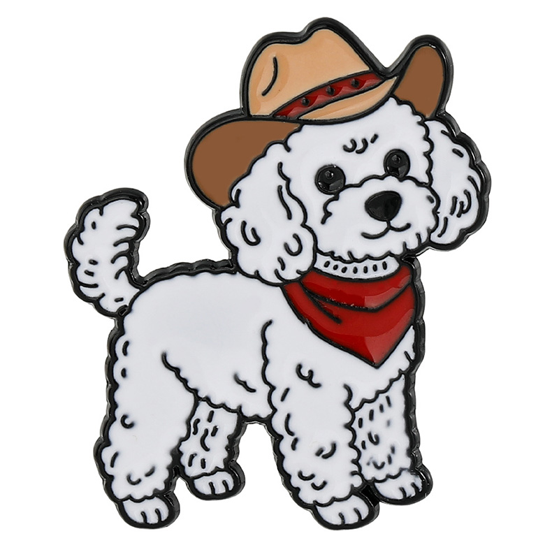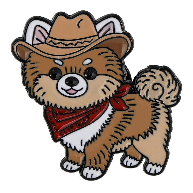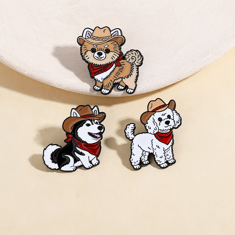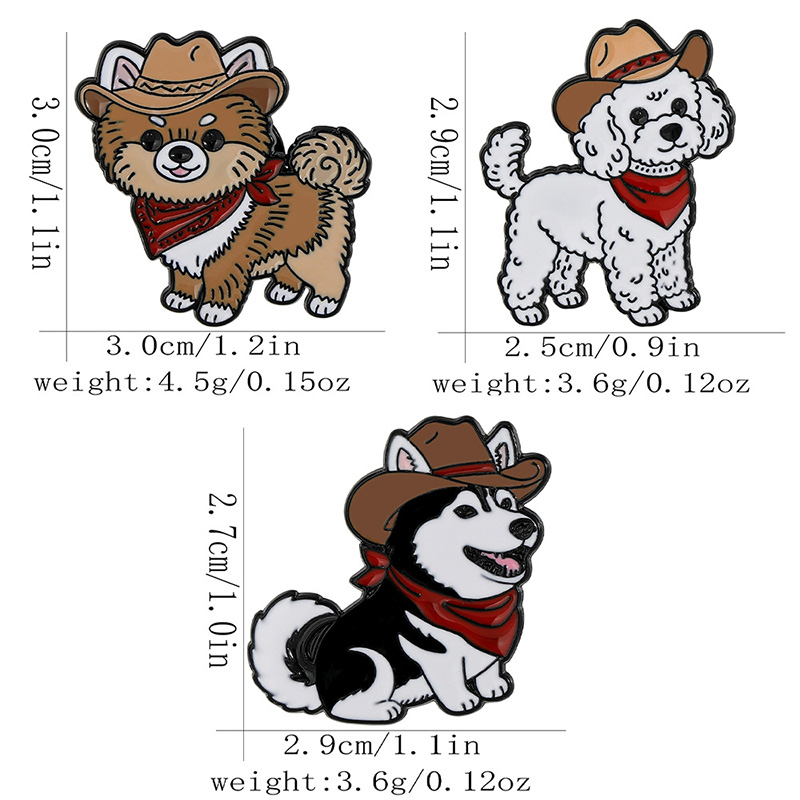 These pins feature cartoon silhouettes of pomeranian, husky, and poodle—each shaped to match the breed’s distinct look. Designed with cowboy hats, red bandanas, vibrant soft enamel, and detailed fur textures, they blend cute charm with Western-style flair for eye-catching decor.