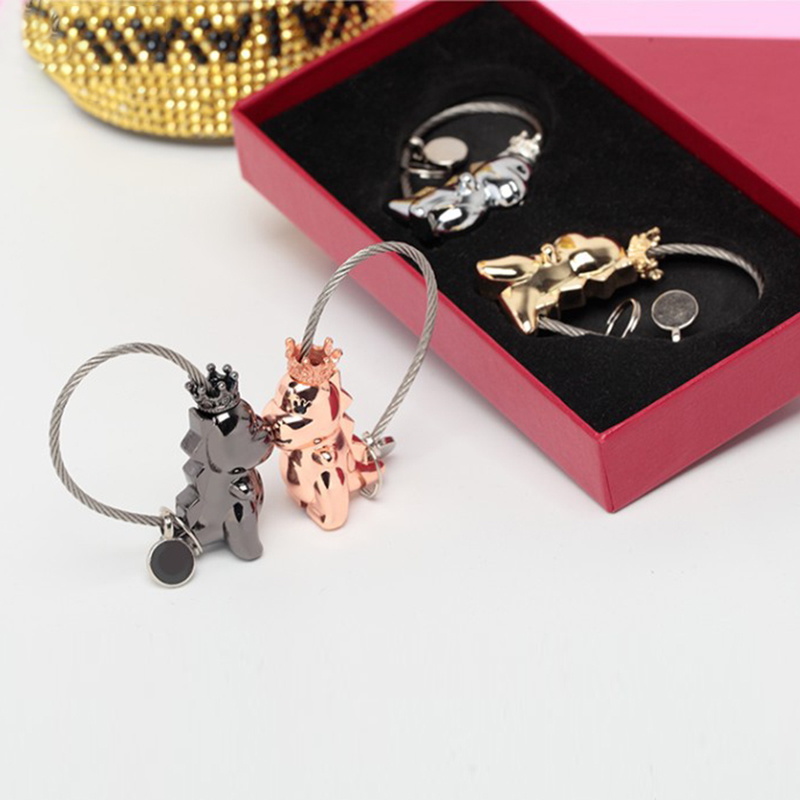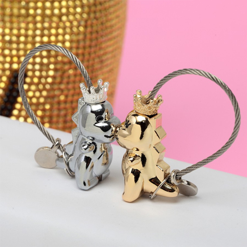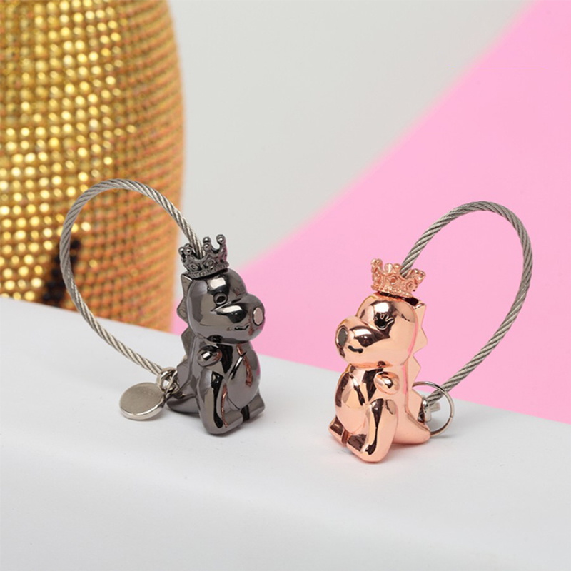 This keychain set features two kissing dinosaurs with crowns—one silver, one gold—on metal cable loops. With a playful, romantic design, it’s perfect for couples as matching key accessories, ideal for daily use or gifting, adding a cute, whimsical touch to keys while symbolizing sweet companionship.