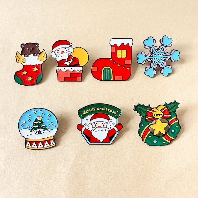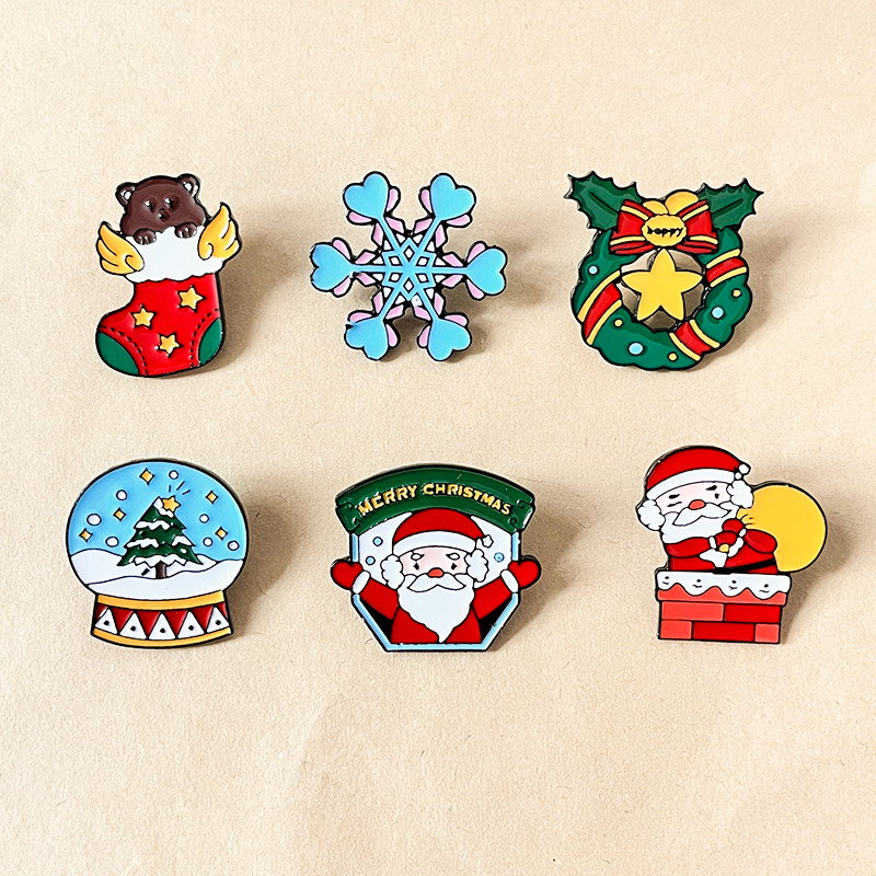 6 charming pins (angel-bear stocking, snowflake, holly wreath, snow globe, Santa badge, chimney Santa) burst with classic Christmas vibes—vibrant hues amplify their cozy, festive charm. Perfect for adding holiday flair to bags/jackets or gifting as cheerful seasonal collectibles.
