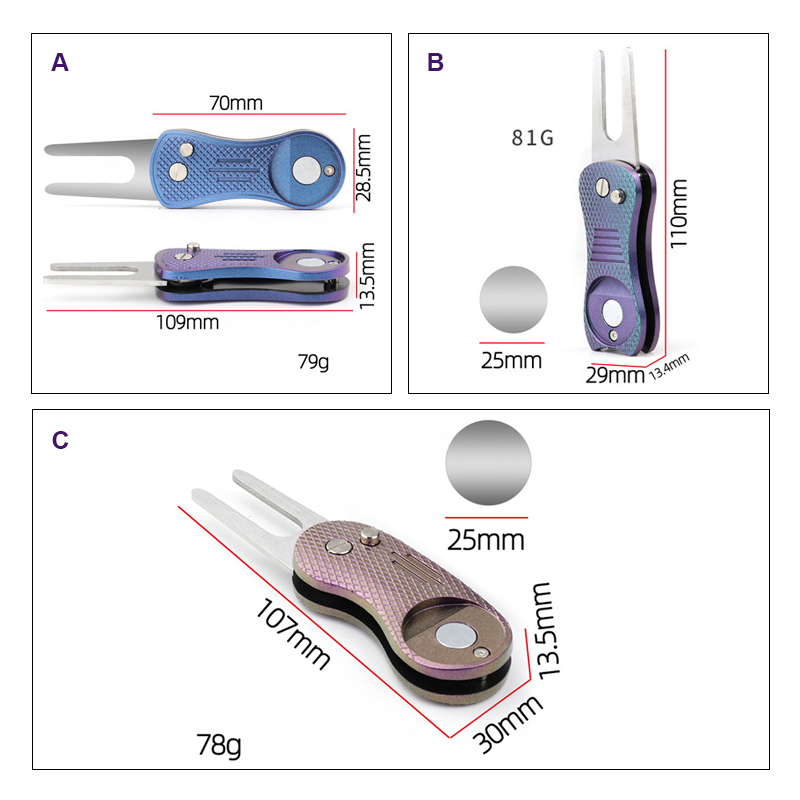 This 24g (78mm) tool features a silicone grip (multiple bright colors) + stainless steel fork, plus a 100mm chain for easy carrying. It’s comfortable to hold, durable for green repairs, and hard to misplace—ideal for casual rounds or golf bag organization.