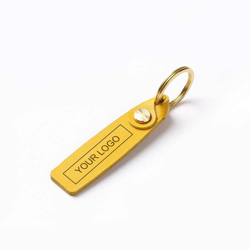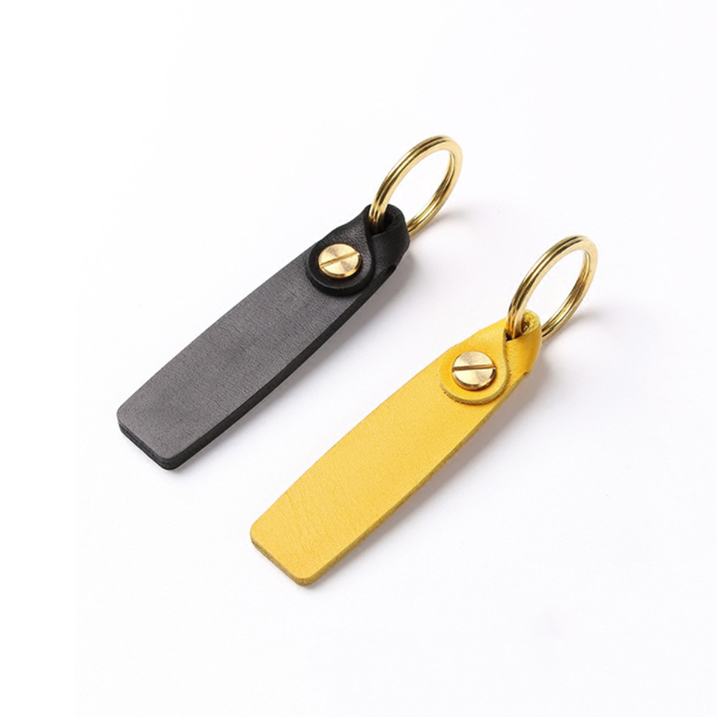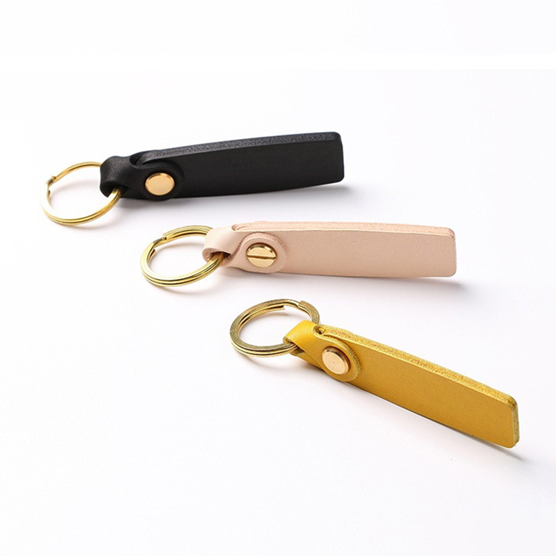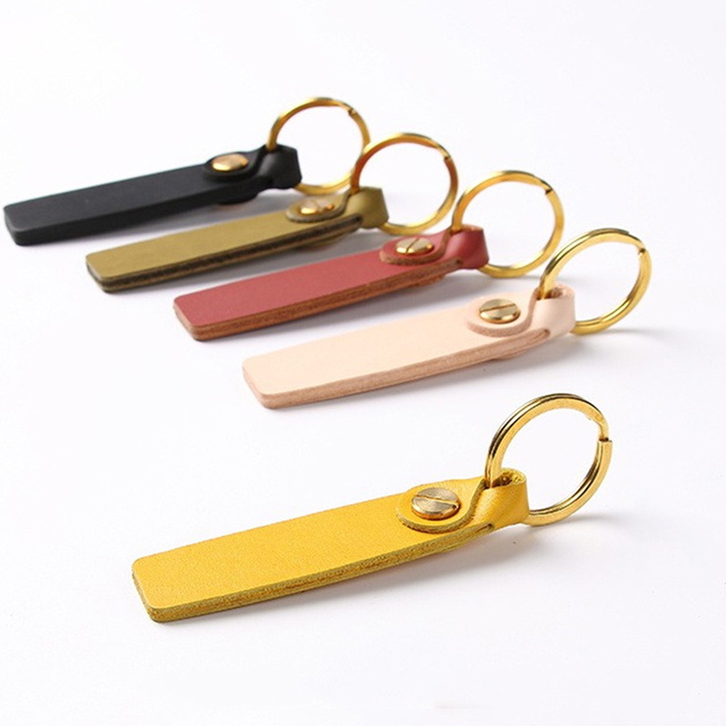 These keychains are crafted from premium leather, available in colors like black, olive green, red, light pink, and yellow. Each features a gold metal key ring and a metal stud, blending durable material with vibrant hues for a stylish, long-lasting accessory.