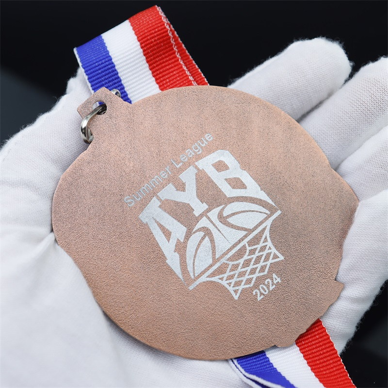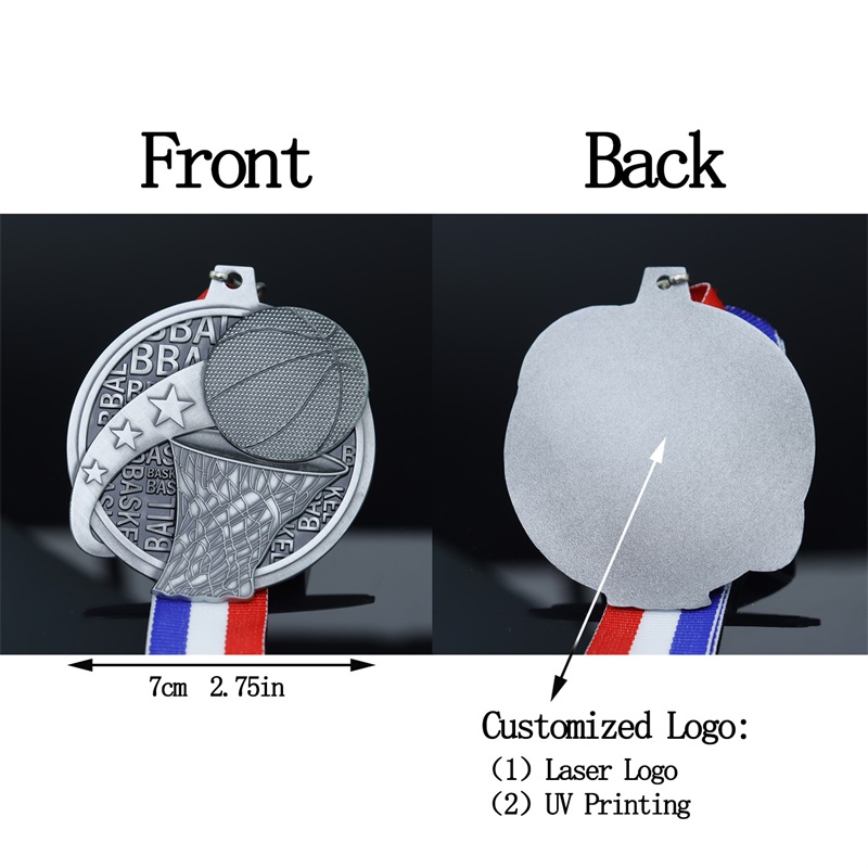 This basketball medal (gold/silver/copper metal) features textured 3D basketball and net motifs, paired with repeating "BASKETBALL" lettering and star accents. Its dynamic, sport-focused design mirrors the energy of the game, making it a vivid, fitting honor for basketball tournament achievements.