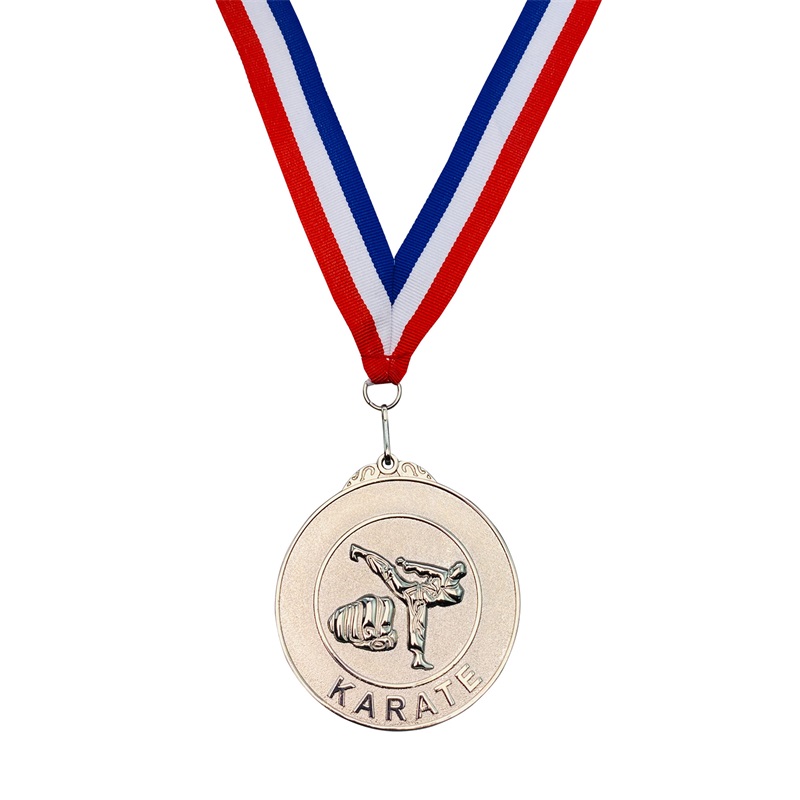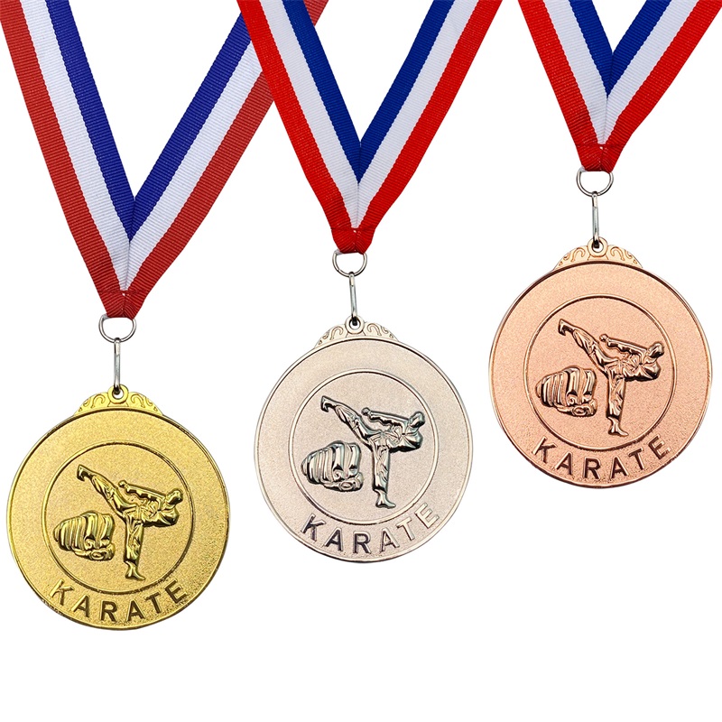 This karate medal (gold/silver/copper metal) features embossed motifs of a dynamic kick and fist—iconic of martial arts skill—paired with bold "KARATE" lettering. Framed by polished edges, its design mirrors the discipline of karate, making it a fitting honor for tournament achievements.