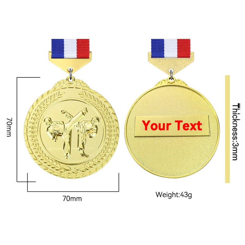 This gold/silver/copper taekwondo medal boasts dynamic embossed kick stances, framed by laurel wreaths. It mirrors martial arts discipline—perfect for honoring tournament skill and victory.