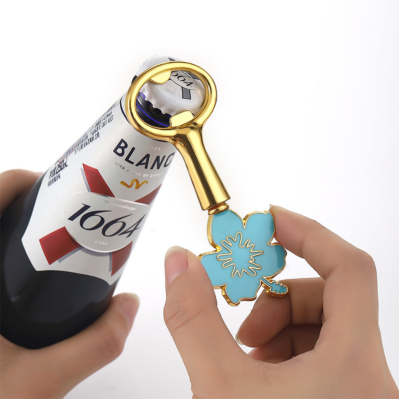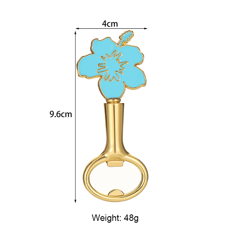 This 48g (9.6cm) opener features a vibrant hibiscus flower top (in blue/white/black/pink enamel) paired with a gold handle. It pops caps smoothly, blending tropical floral charm with playful color—ideal for luau parties, beach weddings, or a cheerful gift for flower lovers.