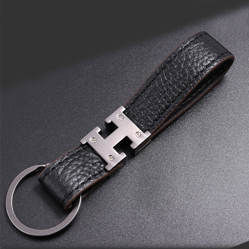 This keychain boasts sophisticated leather straps and polished metallic H-buckles in vibrant orange, deep blue, and sleek black. With a luxurious, minimalist design, it’s an ideal chic accessory for car keys, perfect for daily use or gifting to those who crave refined, stylish practicality.