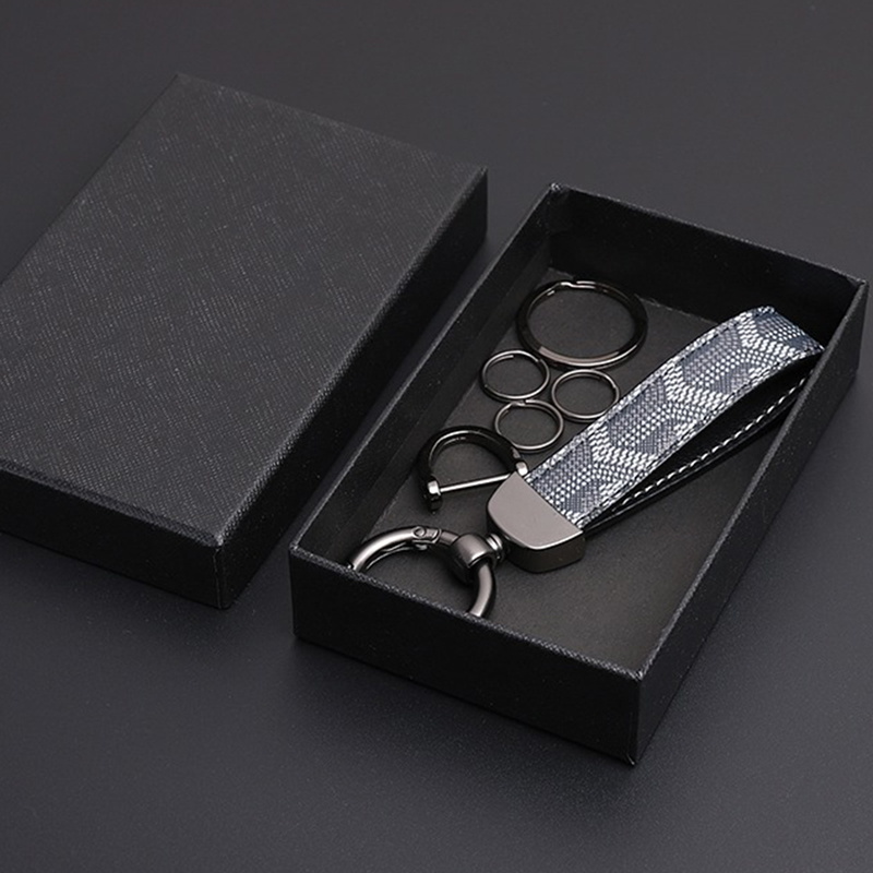 This keychain set features patterned leather straps in red, gray, brown, green, and yellow, paired with sleek metal accents. With a sophisticated, versatile design, it’s ideal for professionals or style-conscious individuals as daily key organizers, perfect for adding a touch of patterned elegance to keys or bags.
