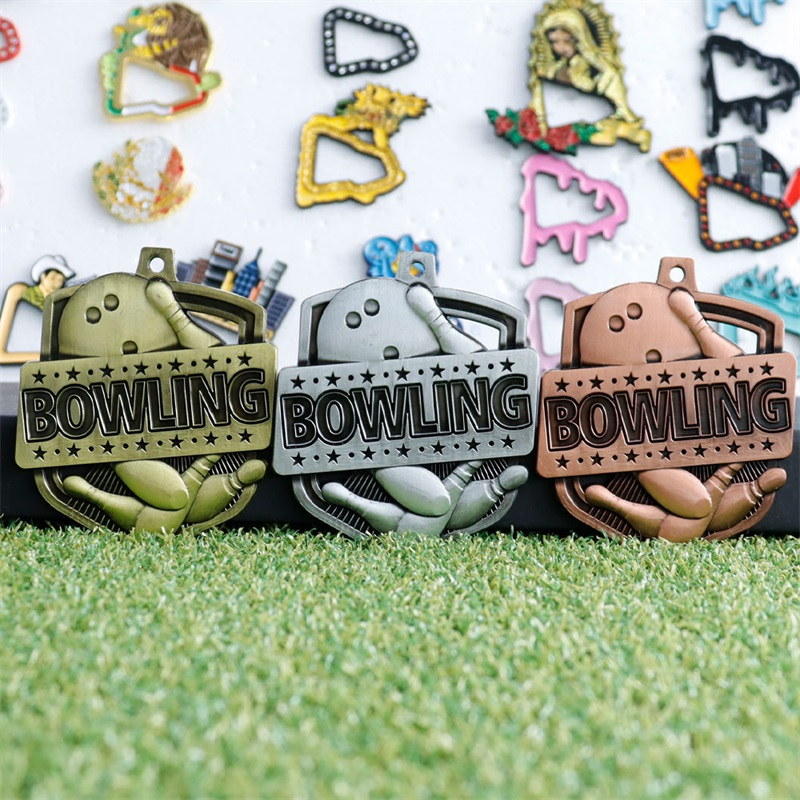 These medals, in Antique silver, Antique gold, and Antique copper, have a shield shape with bowling pins, balls, and "BOWLING" lettering. With a bold, sporty style, they’re used to honor excellence in bowling tournaments and add a competitive touch to sports award events.