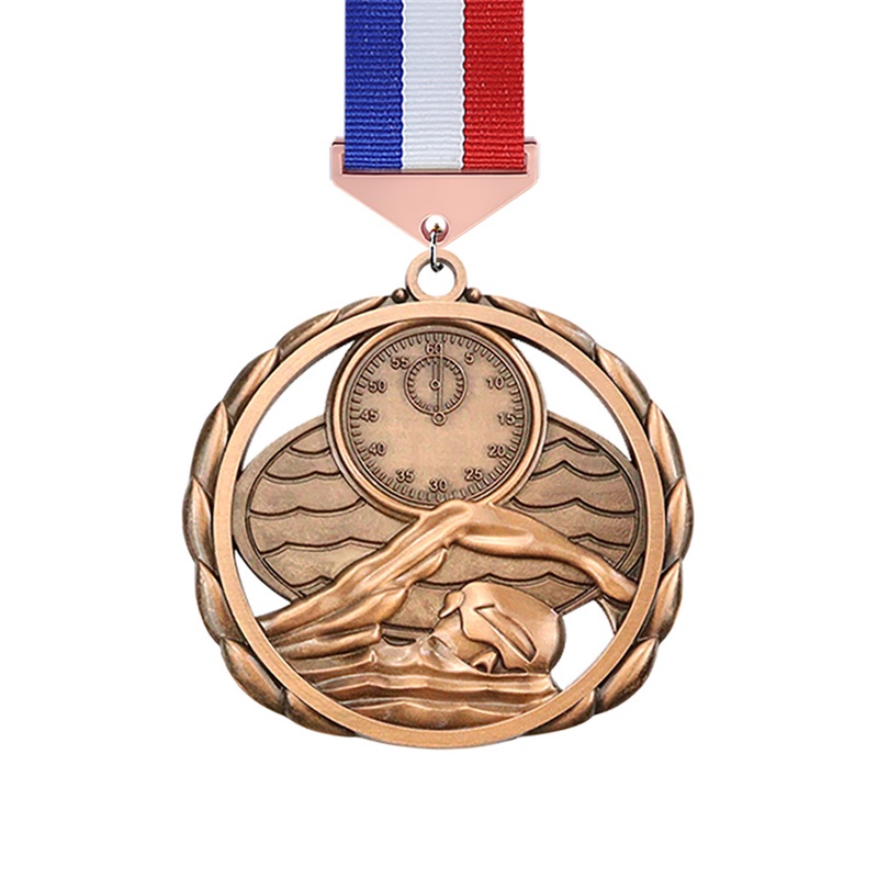 This cut-out swimming medal—finished in antique gold, silver, and copper—boasts an openwork design framing a swimmer motif and stopwatch detail, wrapped in a laurel-inspired border. It blends visual depth with sporty charm, making it a standout award for recognizing achievements in aquatic races and swim events.