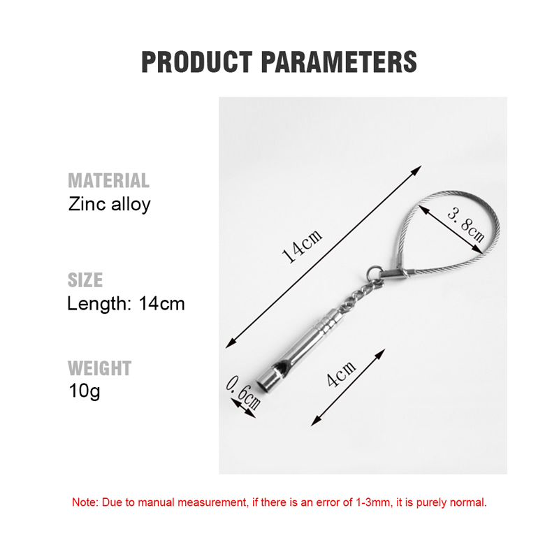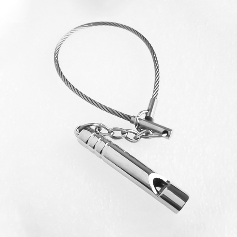 This silver metal whistle keychain has a polished finish, connected by a metal rope chain. It’s practical for outdoor use, acting as a sleek and functional safety accessory.