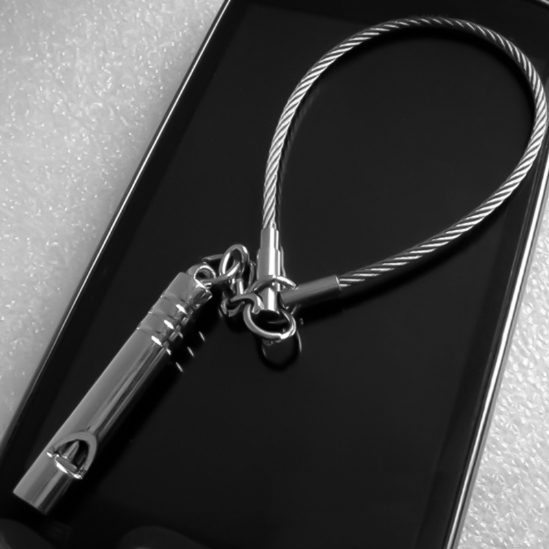 This rugged silver metal whistle keychain, linked by a tough metal cable, boasts a sleek, polished design. It’s a versatile, heavy-duty accessory perfect for outdoor pursuits, merging practical safety utility with a robust, stylish look.