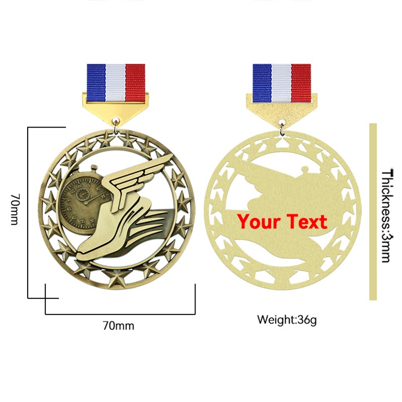 This track & field medal (gold/silver/copper metal) features dynamic motifs: a winged running shoe and stopwatch, framed by stars. Crafted for running races, its sleek cut-out design blends athletic energy with durable build—ideal for honoring speed and race achievements.