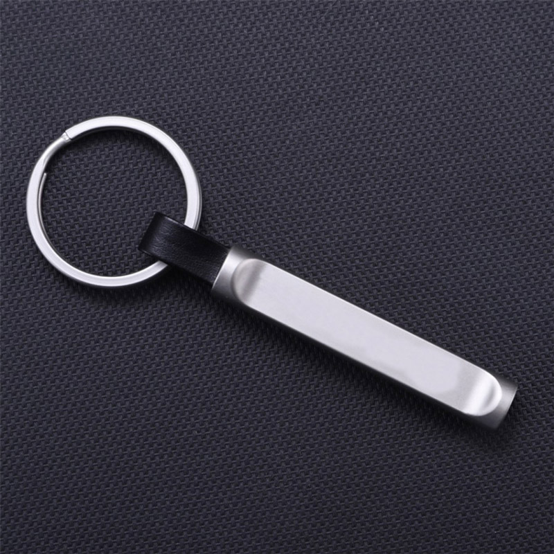 This keychain showcases a sleek metal bar with a leather loop and silver key ring. Embracing a minimalist aesthetic, it relies on clean lines, polished metal, and subtle leather detailing, offering a refined, uncluttered look perfect for those who favor understated style in daily accessories.
