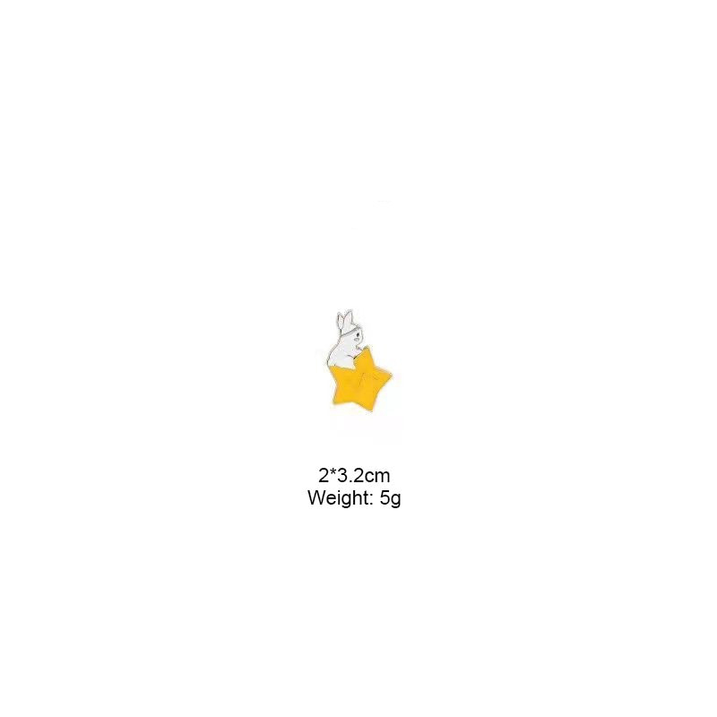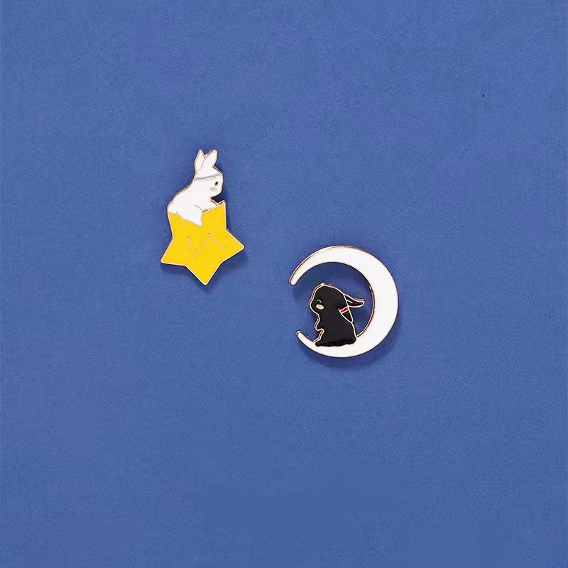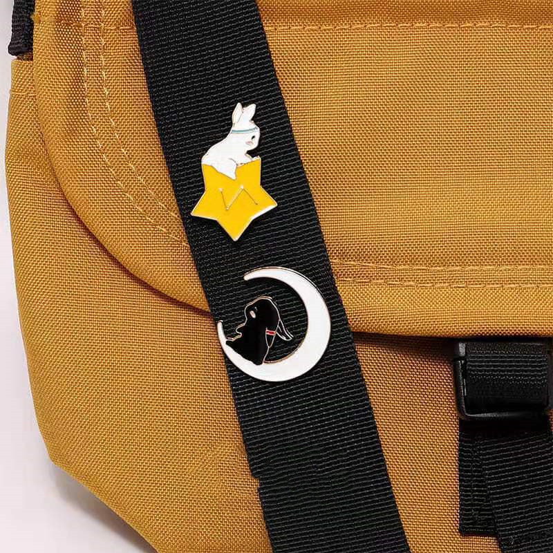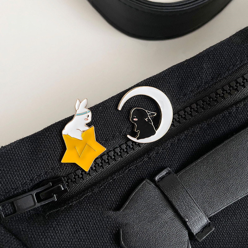 2 charming pins feature a white rabbit nested in a star (with a headband) and a black rabbit curled in a moon—soft celestial styling blends cute bunny charm with dreamy night-sky vibes. Perfect for adding whimsical flair to bags/jackets or collecting as cozy celestial keepsakes.