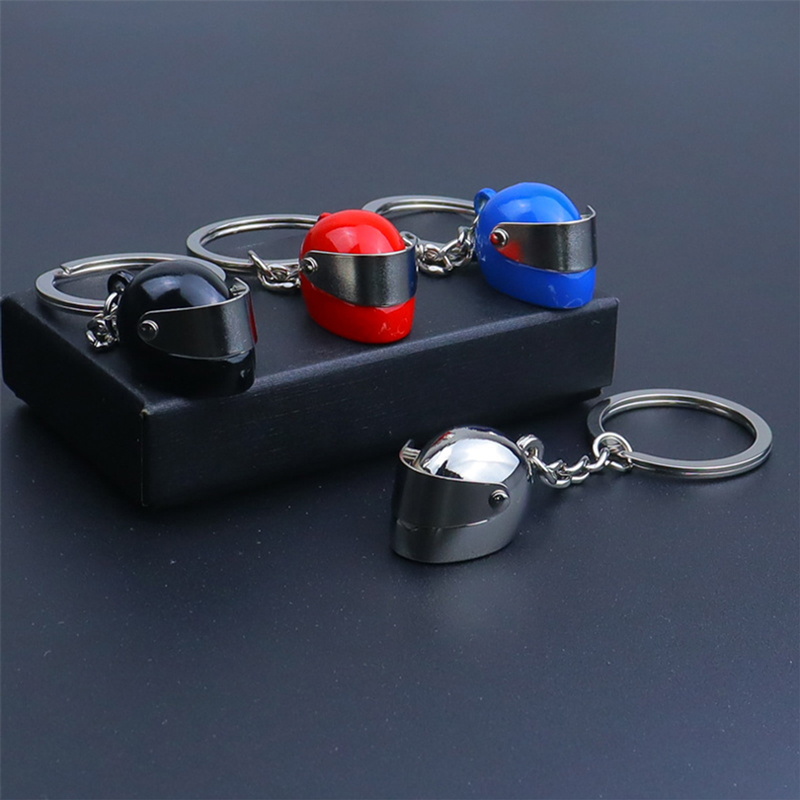 This keychain features miniature racing helmet replicas in colors like blue, red, black, and silver. With a motorsport-inspired design, the durable metal and plastic construction appeals to racing fans, offering a sleek, detailed accessory for keys or bags.