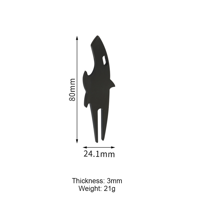 This 21g (80mm) shark-shaped tool (black/silver/gold) fixes green divots and doubles as a bottle opener. Its 3mm thickness ensures durability, and the keyhole design adds portability—unique, practical, and a fun addition to any golfer’s gear.