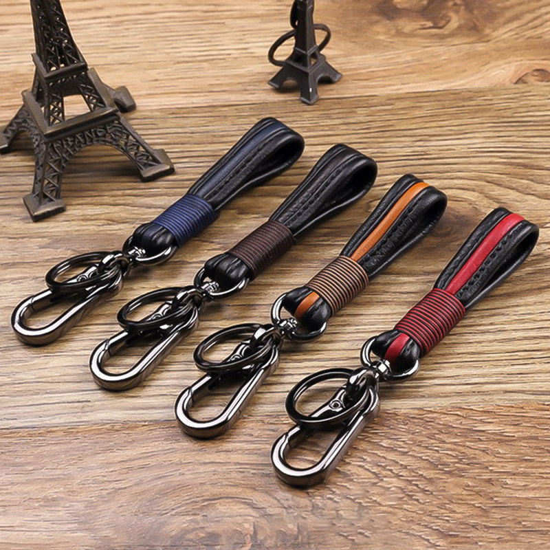 These keychains are made of premium leather, available in colors like navy blue, black, black with orange accents, and black with red accents. Each features metal hooks and rings, with leather straps wrapped in colored cords, blending durable leather and metallic elements for a stylish, multi-hued accessory.