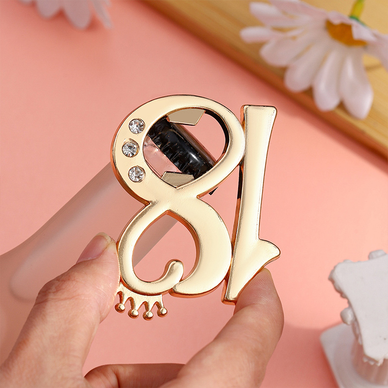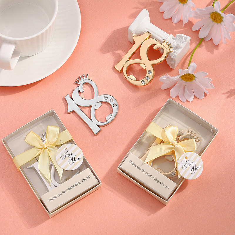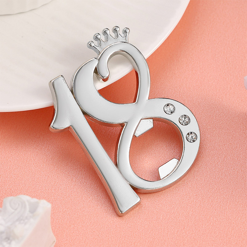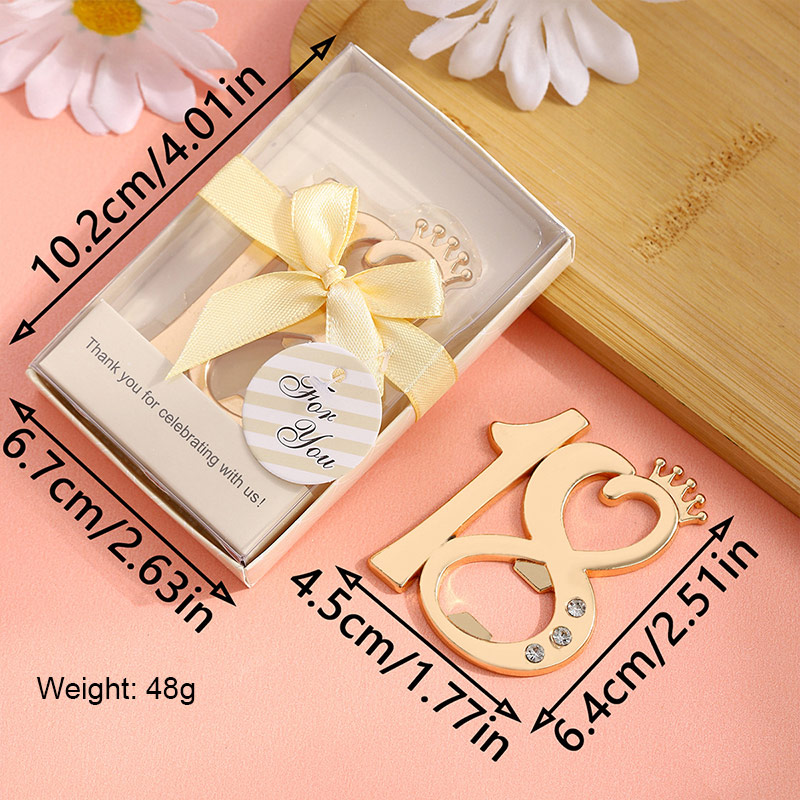 This 48g (6.4cm) gold/silver opener features the "18" shape with decorative crystals and a crown detail. It smoothly opens bottle caps, making it a perfect favor for 18th birthday parties or coming-of-age celebrations—both functional and a memorable keepsake.