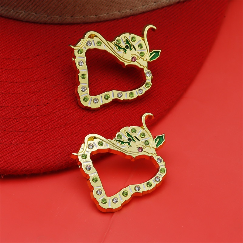 These pins feature hollow, ornate silhouettes (with floral-enamel details), framed in shiny gold and dotted with sparkling green gems. Used to adorn caps or bags, they infuse luxurious, intricate charm—perfect for elevating accessories with eye-catching, opulent flair.