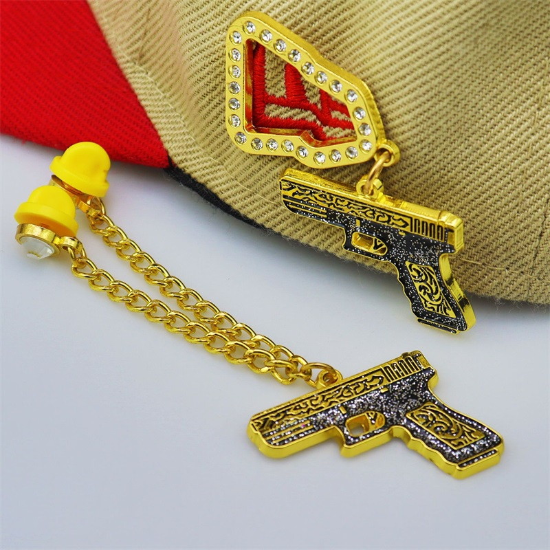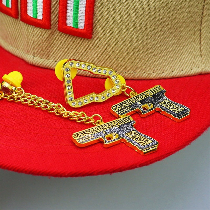 Glittery black-gold pistol charms (intricate patterns) paired with crystal-lined buckles, gold chains & yellow rubber accessories. Bold, edgy accessories—eye-catching details for standout hat styling with streetwear flair.