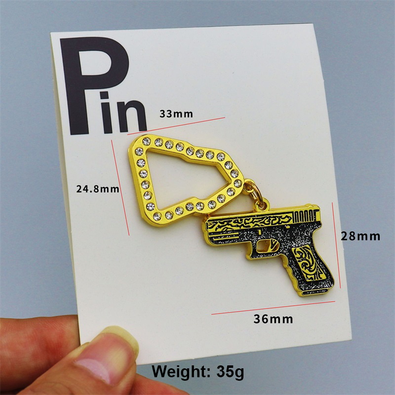These accessories feature realistic pistol silhouettes (detailed with intricate patterns + glittery black-gold finishes) paired with angular crystal-lined buckles and rounded Rubber accessories, linked by sleek gold chains. Designs blend edgy weapon motifs, sparkling details, and bold hues—vibrant, streetwear-ready, and full of eye-catching contrast.