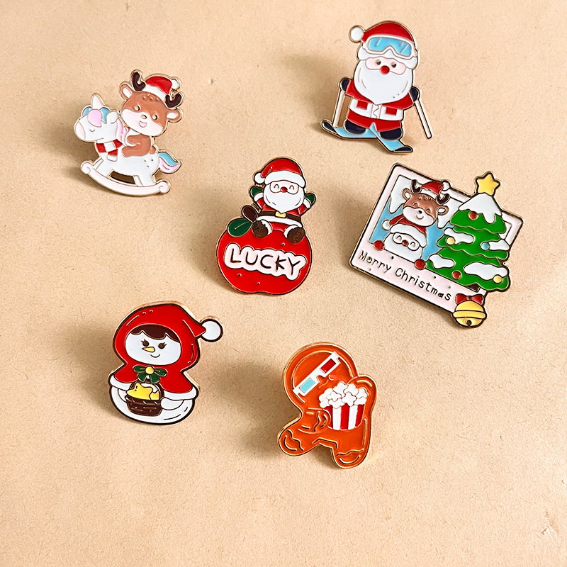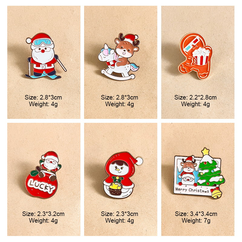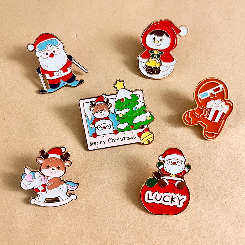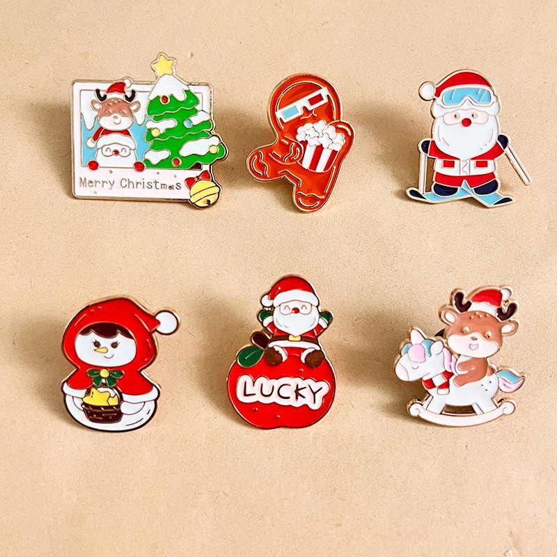 6 whimsical pins (skiing Santa, "Merry Christmas" photo, reindeer rocker, "LUCKY" Santa) — bright enamel, cute holiday details. Perfect for adding cheerful flair to bags/jackets; ideal for Christmas collectibles or festive decor.