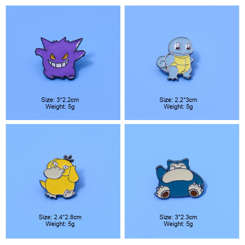 4 iconic Pokémon pins (Squirtle, Snorlax, Gengar, Psyduck) — vibrant enamel, true-to-design details. Perfect for Pokémon fans to add fandom flair to bags/jackets; ideal for daily wear or Pokémon collectible decor.