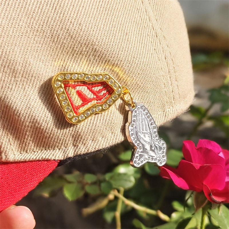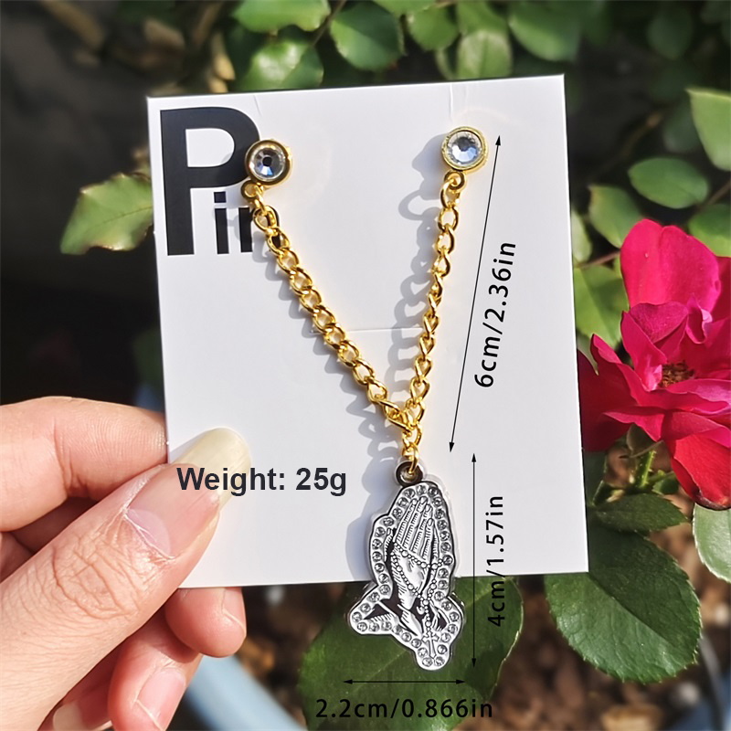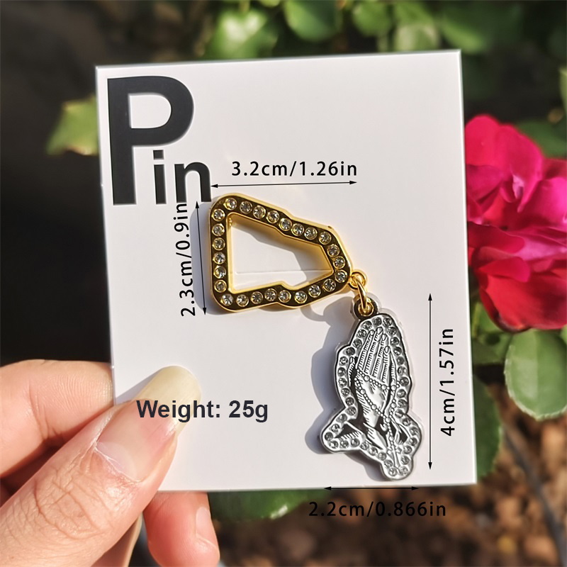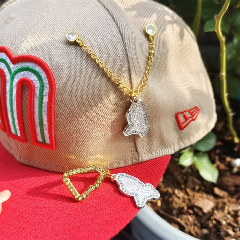 Stylish Cap DecorBoasts a rhinestone-trimmed triangle accent, praying hands pendant & gold chain—metallic, decorative pins for unique, eye-catching cap styling.