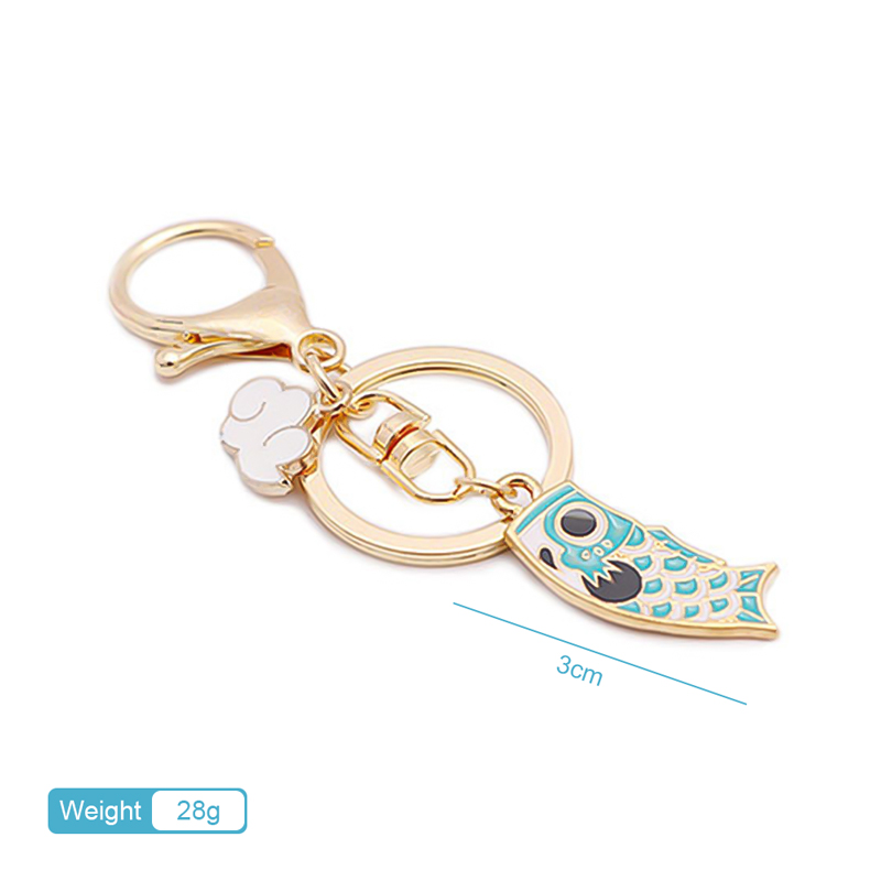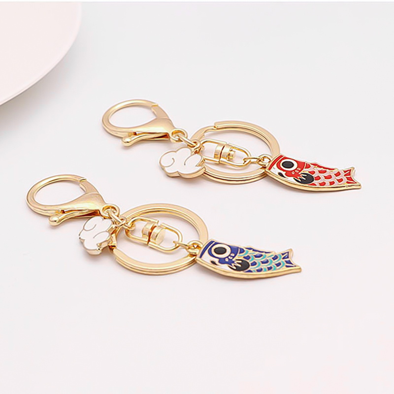These keychains feature colorful koi fish enamel charms (red and blue) with intricate patterns, paired with gold metal rings, clasps, and cloud-shaped accents. The detailed enamel work and metallic finish create a vibrant, culturally inspired design.