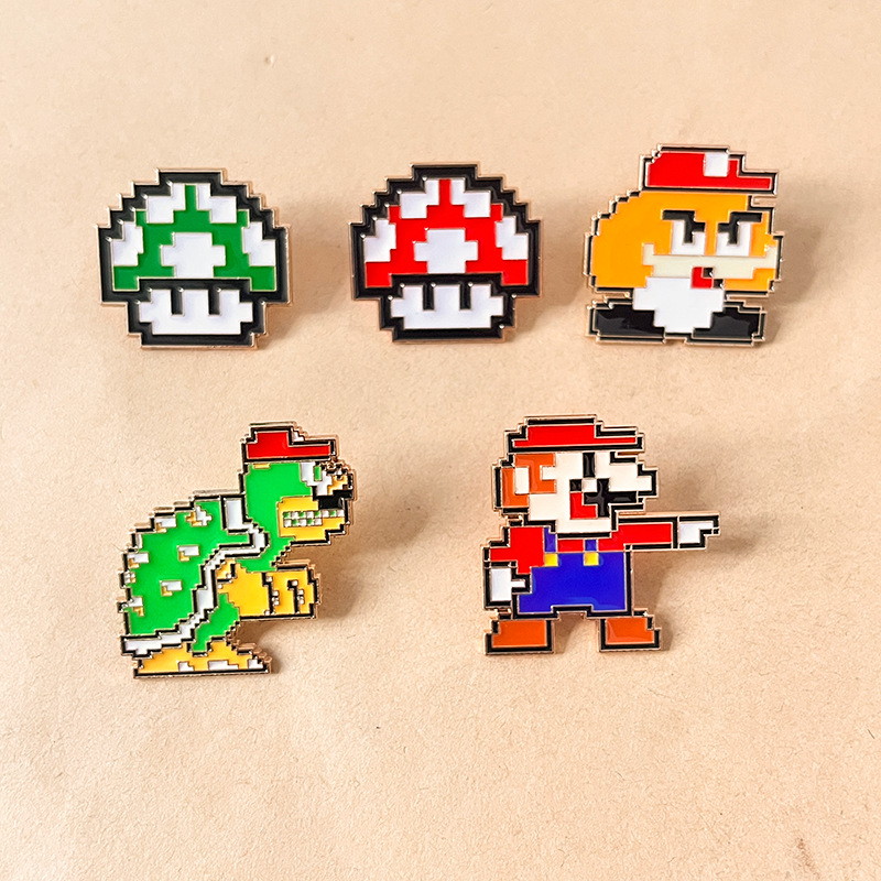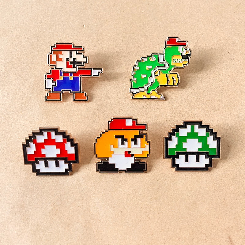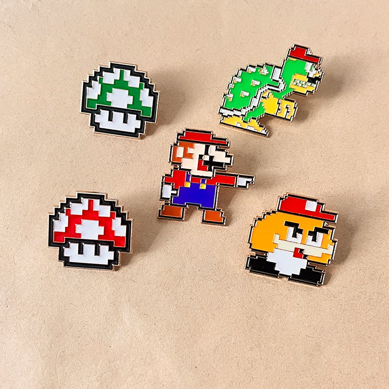 Features iconic Mario characters (Mario, Bowser, mushrooms) in retro 8-bit pixel designs with vibrant enamel. Ideal for gaming fans to decorate jackets, bags, or hats—adding nostalgic, playful charm to daily styles.