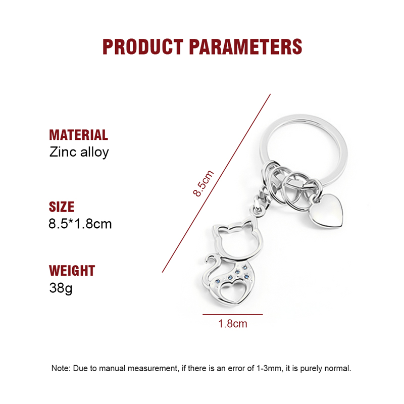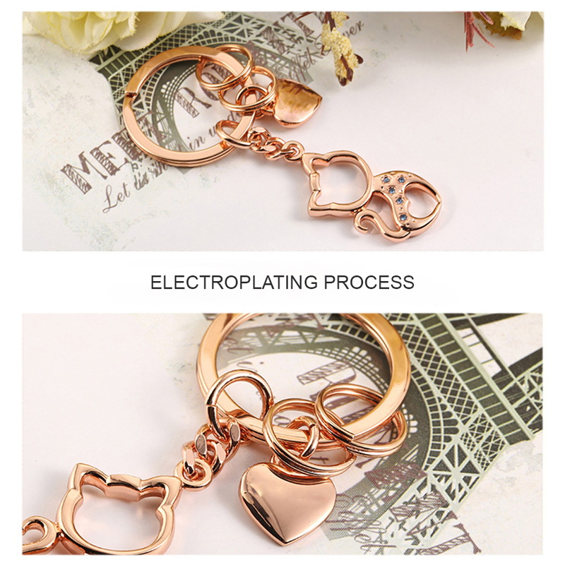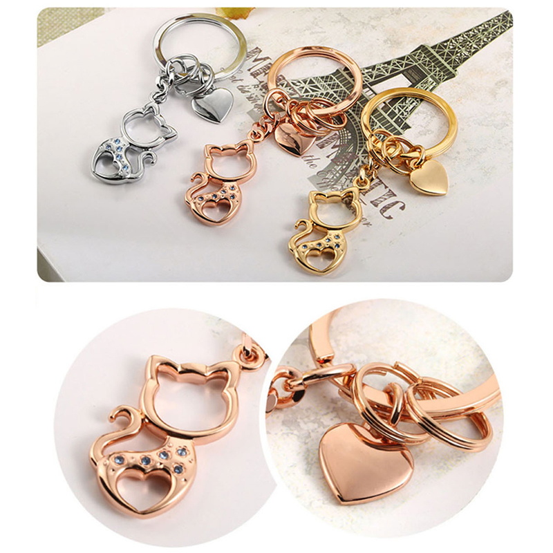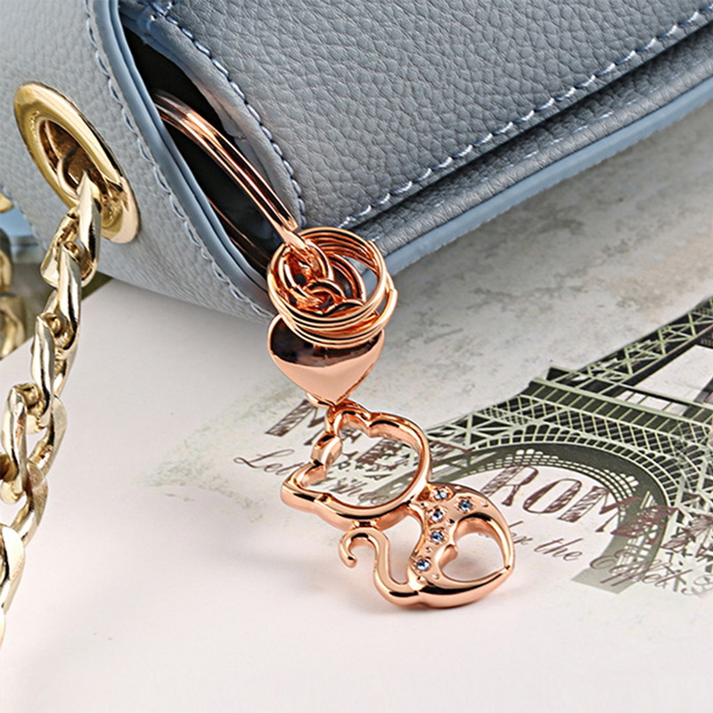 This keychain set features cute cat charms with rhinestones, available in gold, silvery, and rose gold tones, each with a heart accent. With a feminine, whimsical design, it’s perfect for cat lovers as daily key accessories, ideal for adding a sparkling, charming touch to keys or bags, and also makes a lovely gift.