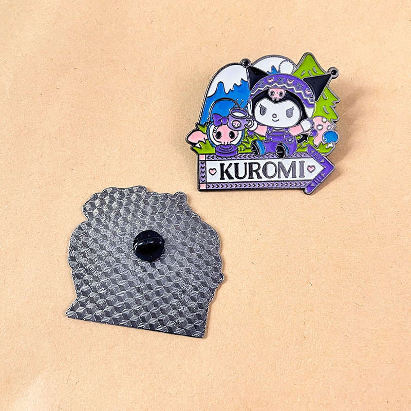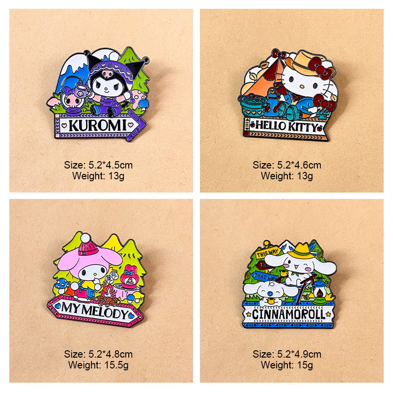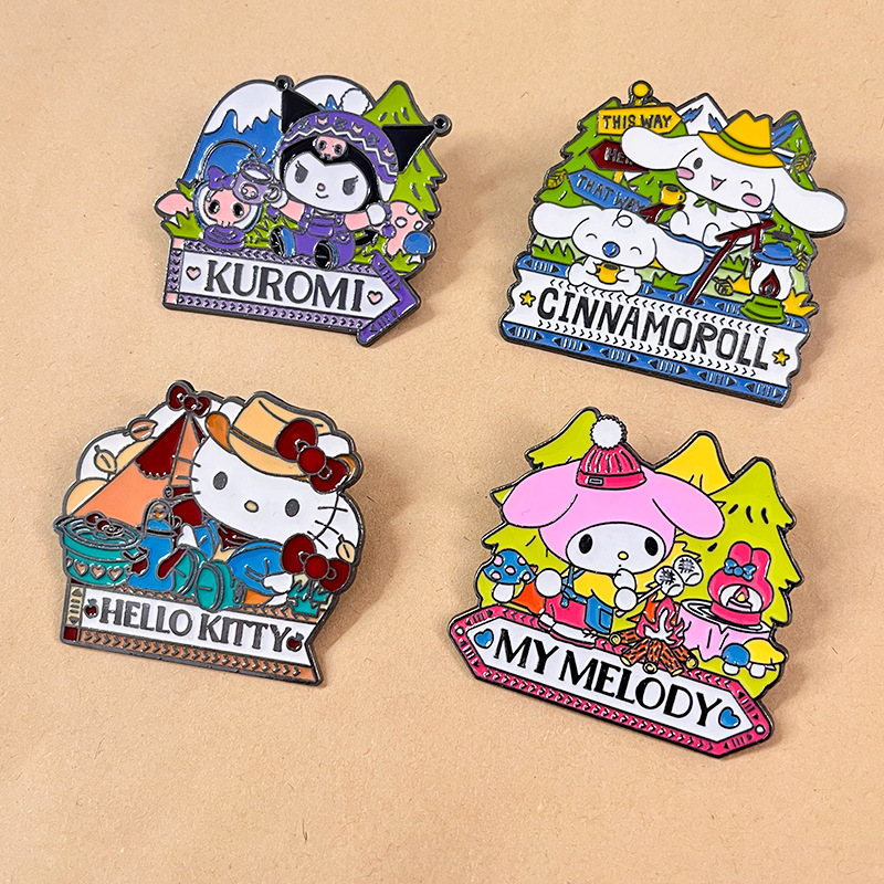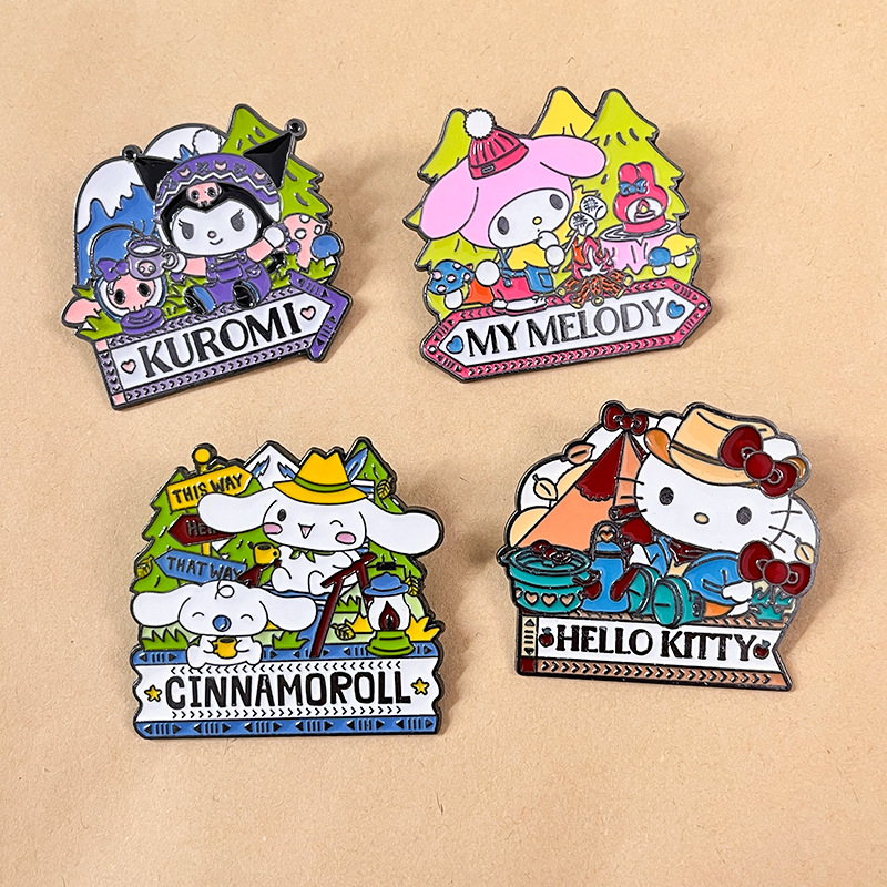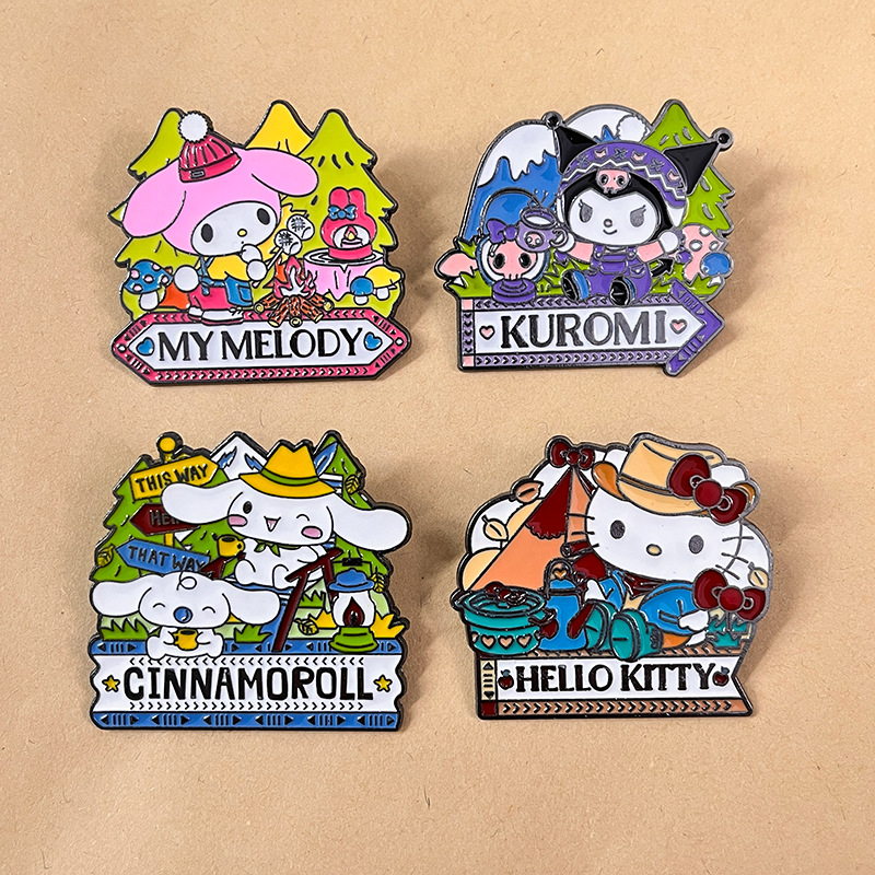 Features My Melody, Kuromi & others in camping scenes with vibrant enamel. Ideal for Sanrio fans to add playful, nostalgic flair to bags, jackets, or hats—perfect for fandom styling or outdoor-themed accessory accents.
