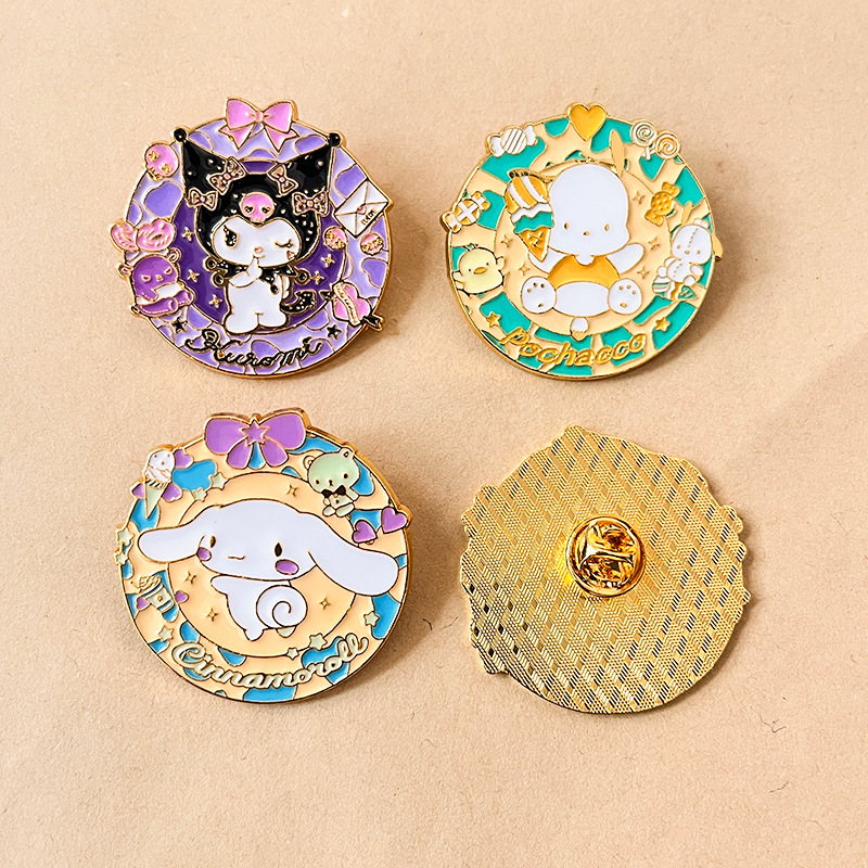 4 vibrant Sanrio pins (Pochacco, Kuromi, Hello Kitty, Cinnamoroll) with cute decorative details—fan-loved flair. Perfect for styling bags/jackets; ideal for daily wear or Sanrio collectible decor.