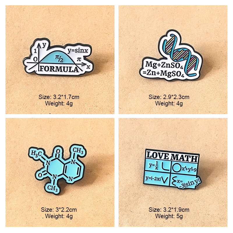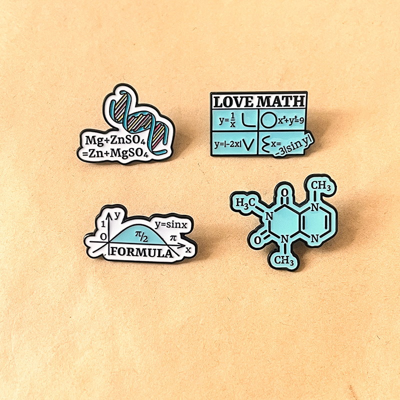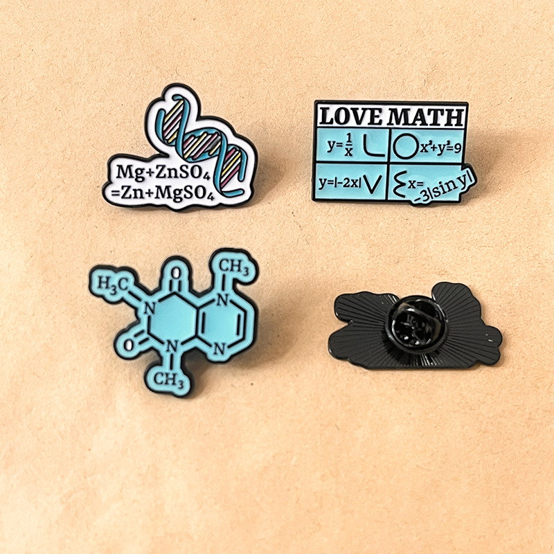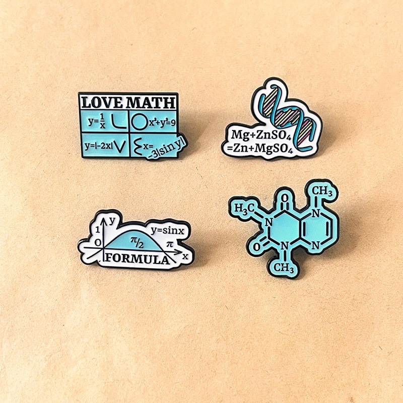Features chemistry structures, math equations, DNA, and formulas with vivid enamel. Ideal for students/enthusiasts to add clever, academic flair to bags, jackets, or lanyards—perfect for geeky daily styling.