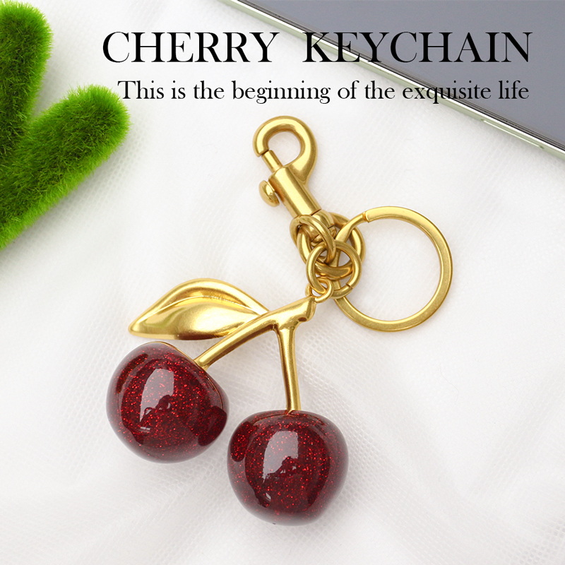 This keychain features glittering resin cherries with a glossy, sparkly finish, paired with gold-tone metal hardware. Its cute, playful design blends whimsical charm and trendy aesthetics, making it a fashionable, eye-catching accessory for women who love sweet, vibrant styles.