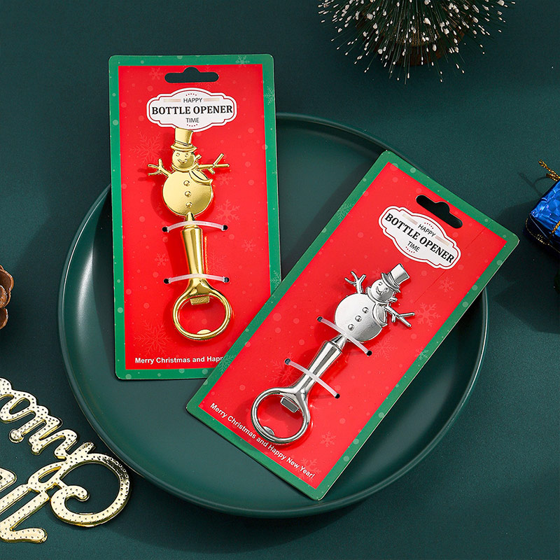 This 59g (10.6cm) opener is shaped like a festive snowman (gold/silver), doubling as a bottle stopper. It pops caps easily, making it a cheerful favor for Christmas parties, holiday gatherings, packaged with "Merry Christmas" branding.