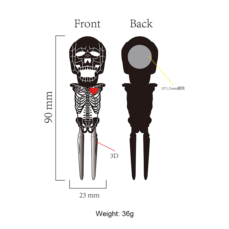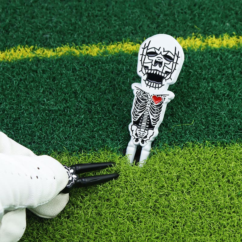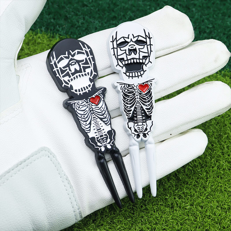 This 36g (90mm) skeleton-shaped tool (black/white) fixes green divots. It features vivid 3D bone details, a red heart accent, and a built-in magnet—merging spooky, playful flair with reliable on-course functionality, ideal for golfers who love unique, themed gear.