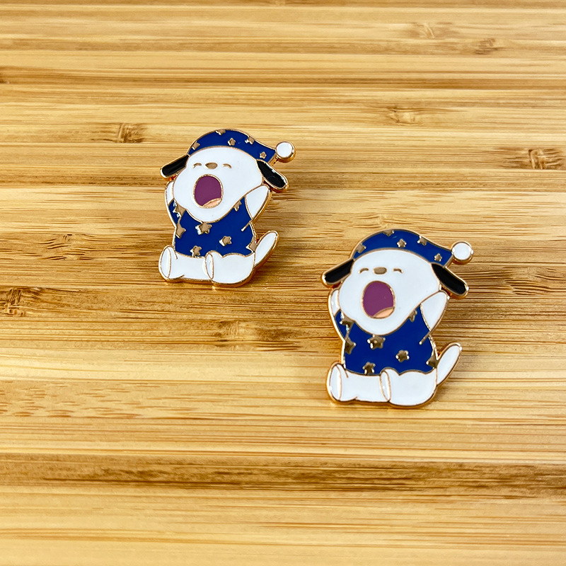 This charming pin features a cozy pup in a star-patterned nightcap, yawning wide—vibrant blue, gold accents, and playful expression amplify its cuddly, whimsical vibe. Perfect for adding sweet flair to bags/jackets or displaying as a cute pet collectible.