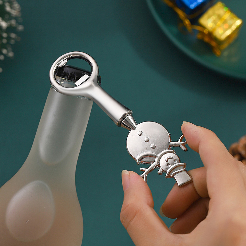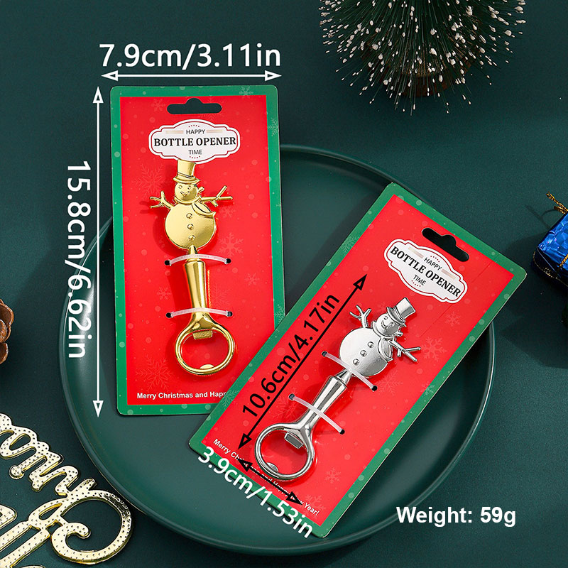 This 59g (10.6cm) opener is shaped like a festive snowman (gold/silver), doubling as a bottle stopper. It pops caps easily, making it a cheerful favor for Christmas parties, holiday gatherings, packaged with "Merry Christmas" branding.